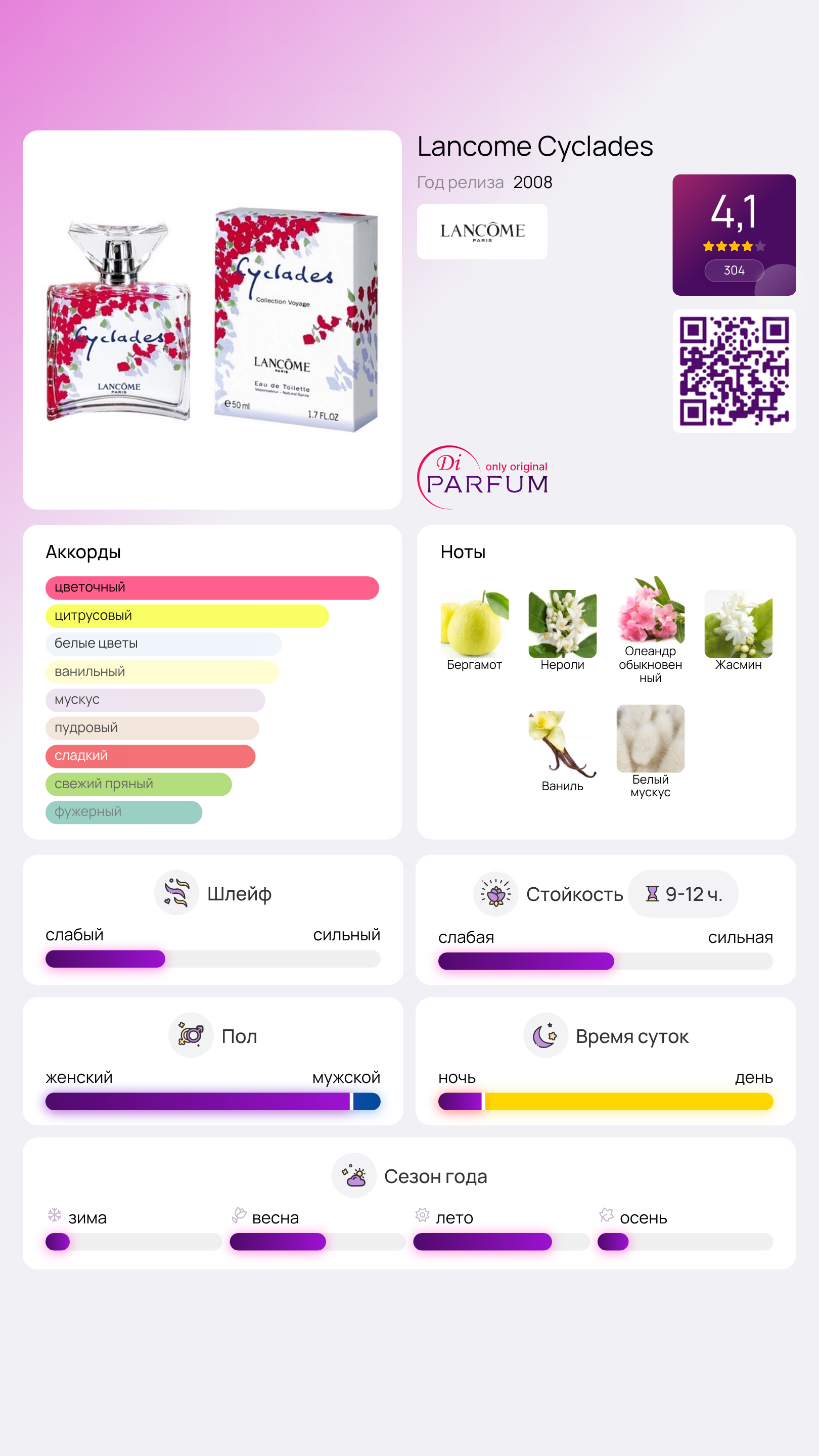 Композиция аромата включает в себя бергамот, жасмин и нероли, которые придают ему великолепную свежесть и легкость. Завершает этот великолепный ансамбль сладкий олеандр, ваниль и белый мускус, создавая завершенное произведение искусства под названием Cyclades.