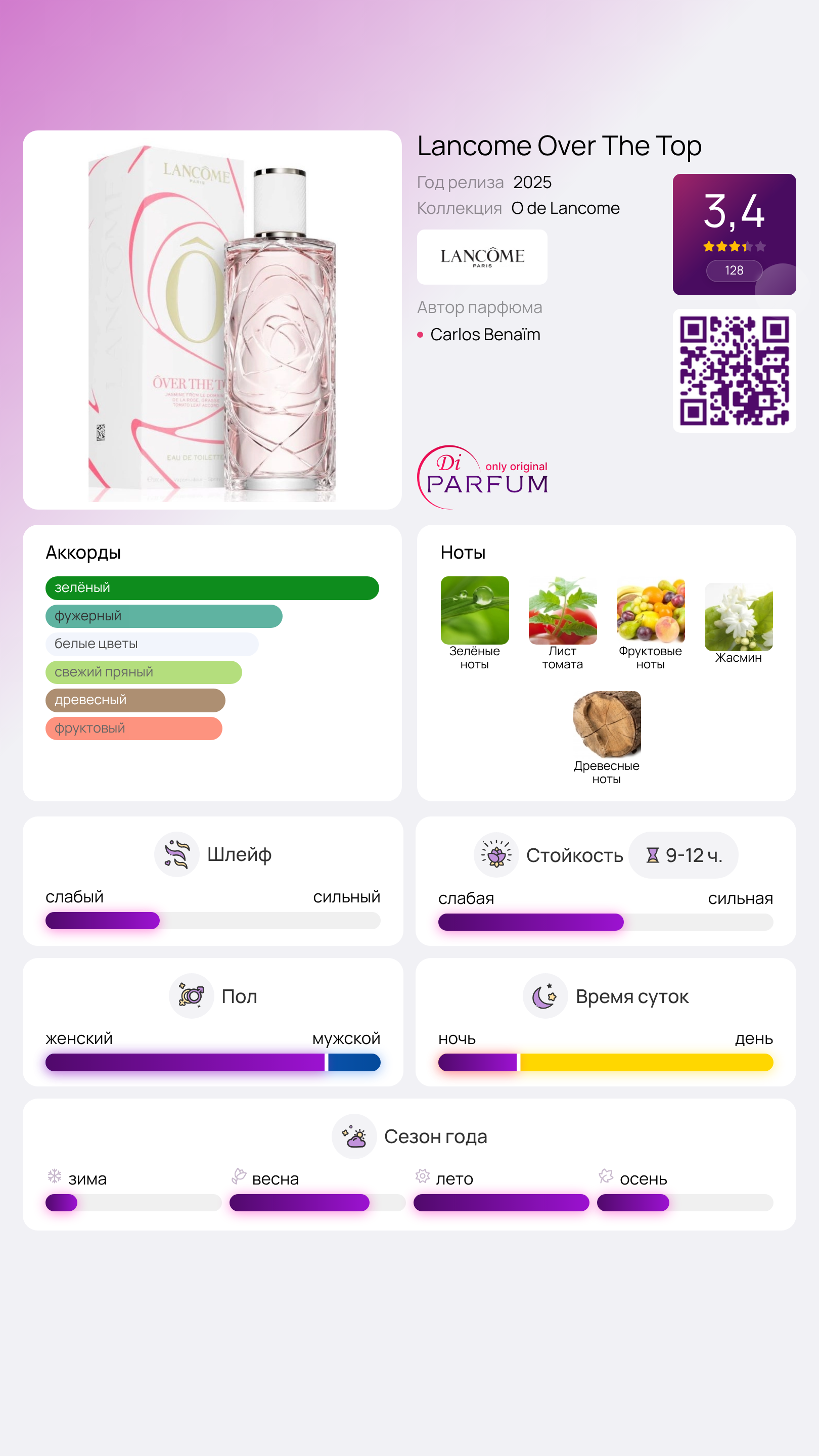 Ôver The Top от Lancôme — это универсальный аромат для женщин и мужчин, который был представлен в 2025 году. Автором ароматической композиции является мастер-парфюмер Carlos Benaïm. Ôver The Top обладает цветочным, зеленым и фруктовым характером, что делает его идеальным выбором для тех, кто ценит свежесть и элегантность в парфюмерии.