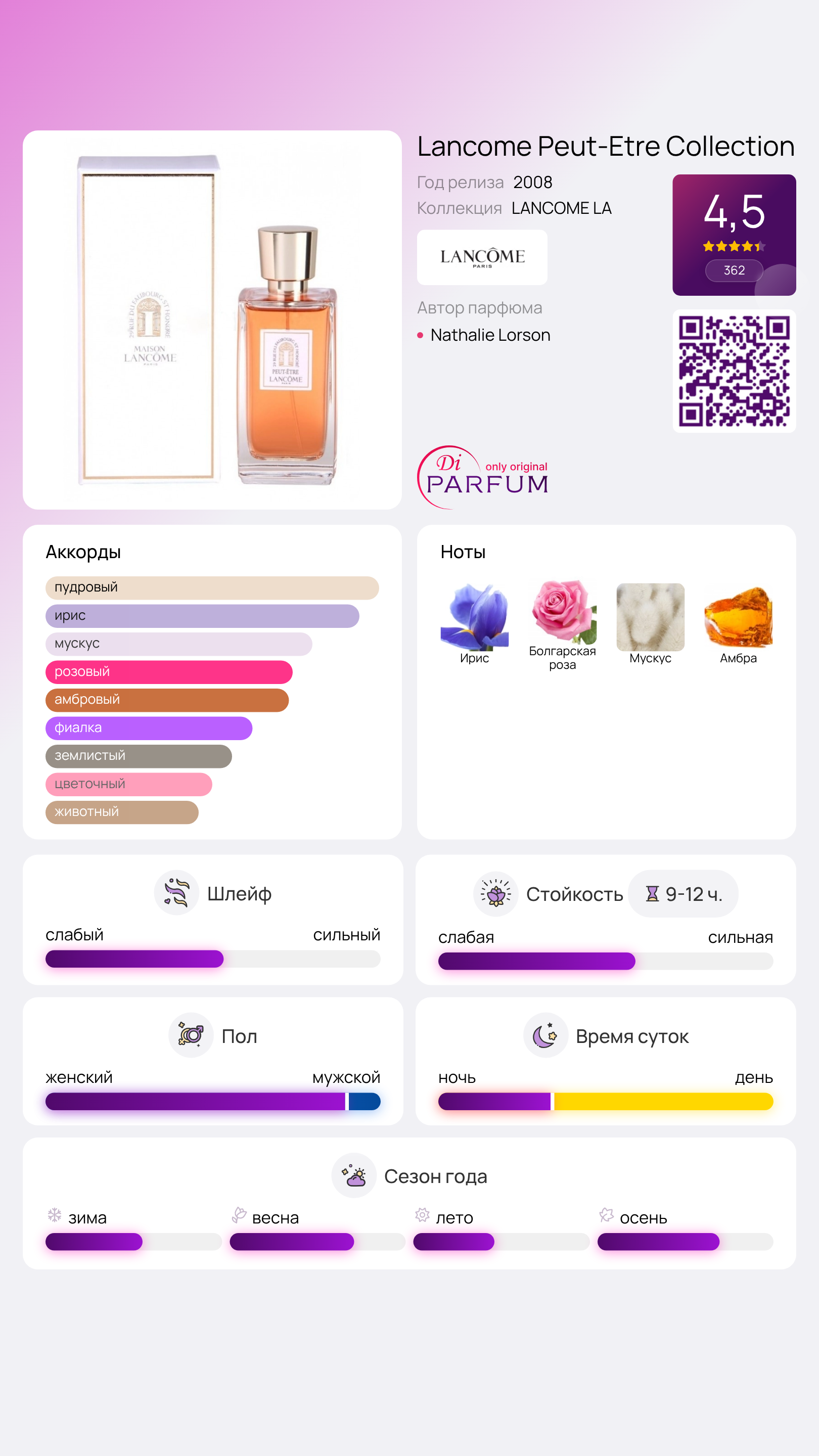 Легкий и свежий морской бриз наполняет воображение, словно сад, утопающий в аромате нежных цветов. Мягкий, деликатный ветер кажется почти прозрачным, а вы сами теряете себя в мирах фантазии. Композиция Peut-Etre охватывает ноты жасмина, ириса и розы. Этот цветочный букет словно украшает волосы и переносит в царство мечтаний и желаний. Закройте глаза, о Принцесса!