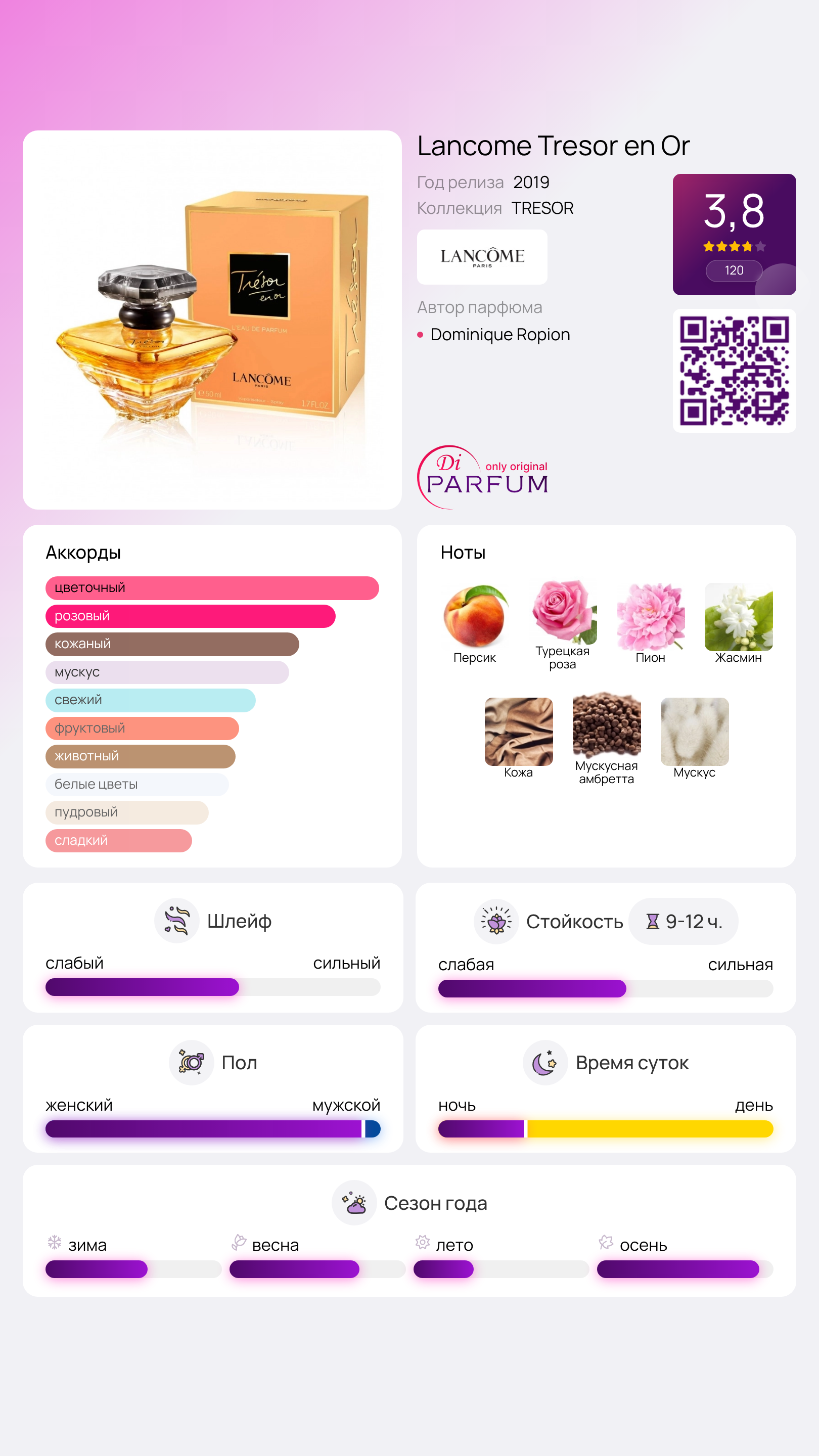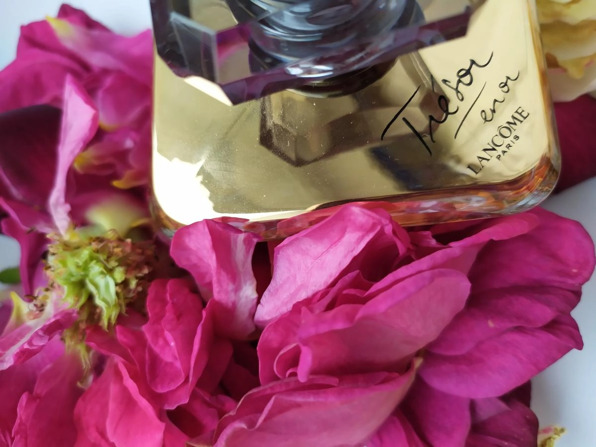 Tresor en Or воплощает восточно-цветочную композицию, которая начинается с верхней ноты сочного персика и включает в себя сердечные ноты изящных цветов, таких как роза, жасмин и пион. В финале аромата раскрываются глубокие мускусные, амбреттовые и кожаные нотки, создавая завершенный и утонченный образ.