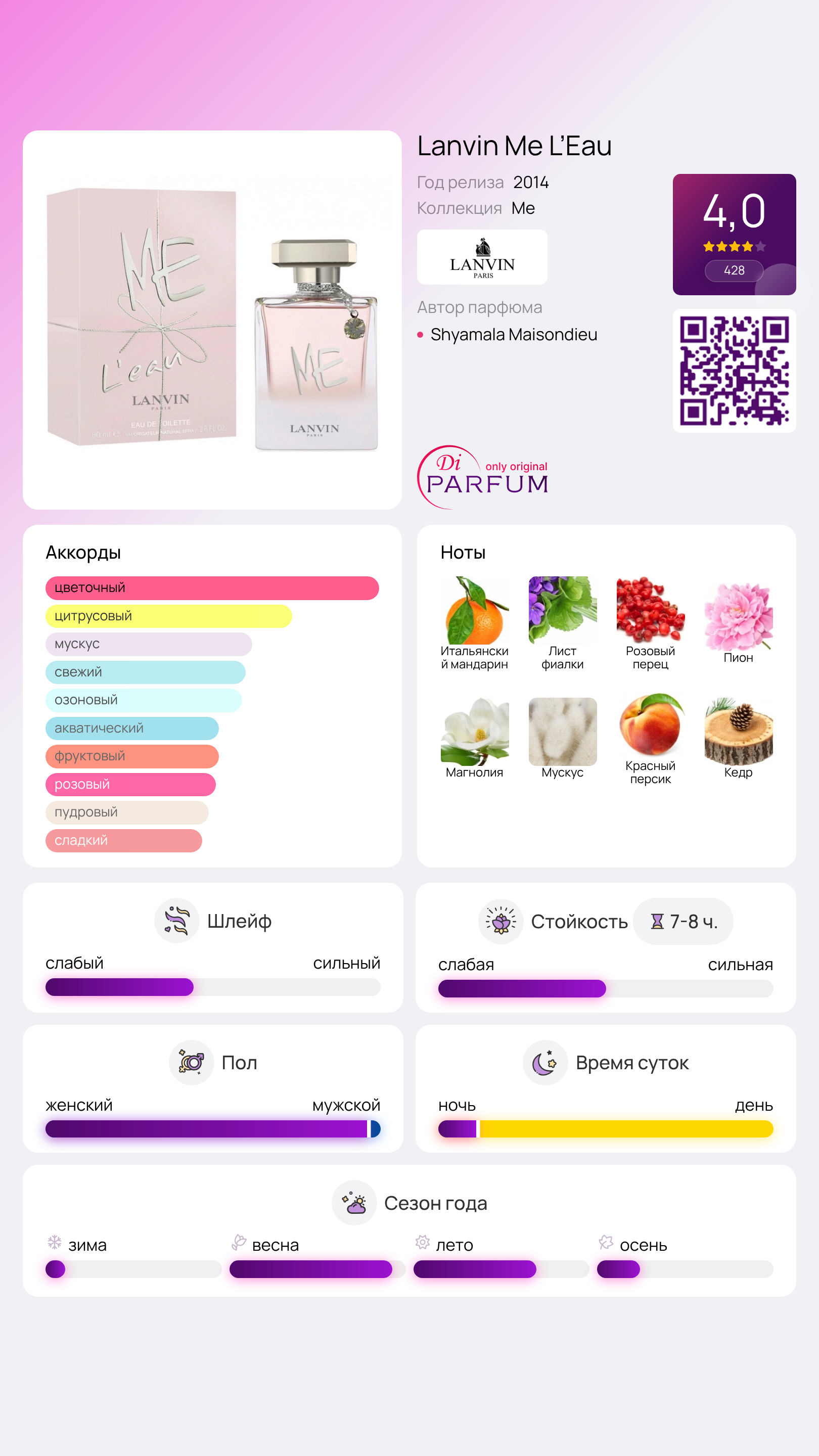 В его композиции можно уловить приятные ноты изысканной фиалки, сочного итальянского мандарина и пикантного розового перца. Сезонный цветочный букет создается благодаря роскошным магнолиям и пионам.