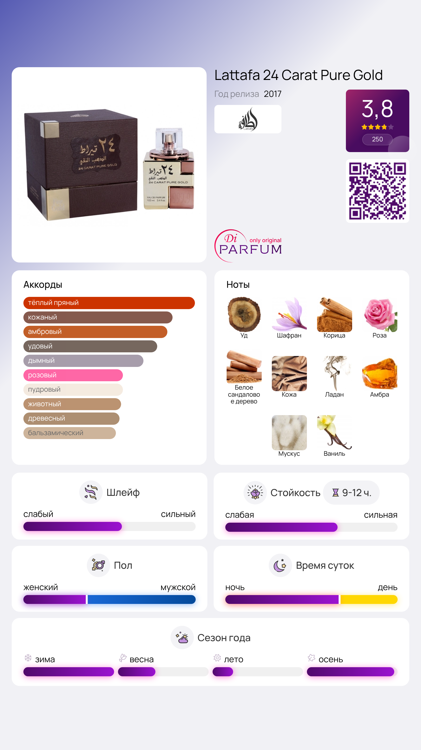 24 Carat Pure Gold от Lattafa является поистине зимним ароматом, который идеально дополнит как деловой, так и вечерний наряд.