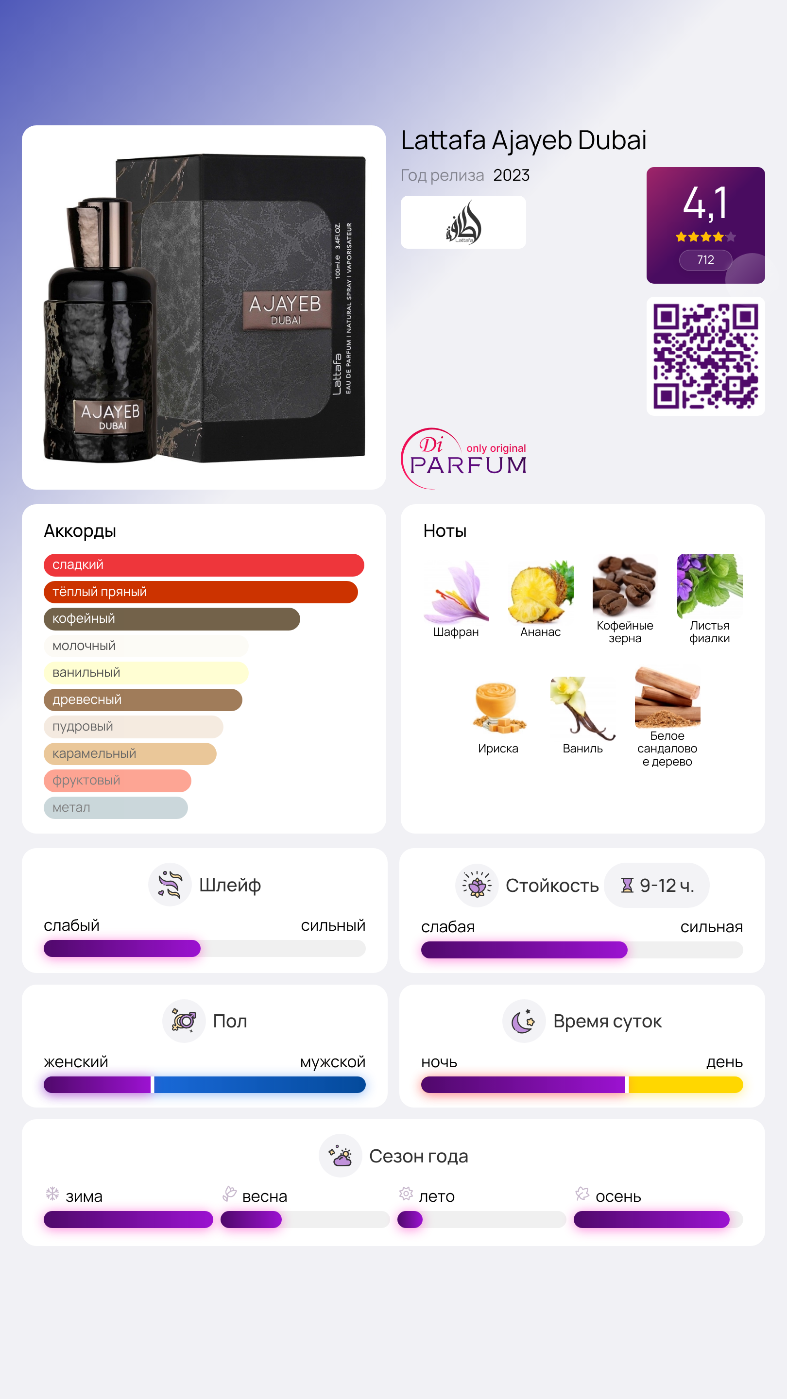 Верхние ноты аромата раскрываются ярким аккордом шафрана и ананаса, создавая освежающее и экзотическое первое впечатление. Сердце композиции наполнено глубокими и насыщенными нотами кофе и листьев фиалки, придающими аромату особую сложность и глубину. Завершает ароматная палитра тепло и уют, рожденные благодаря базе из сандалового дерева, ванили и сладкой ириски.