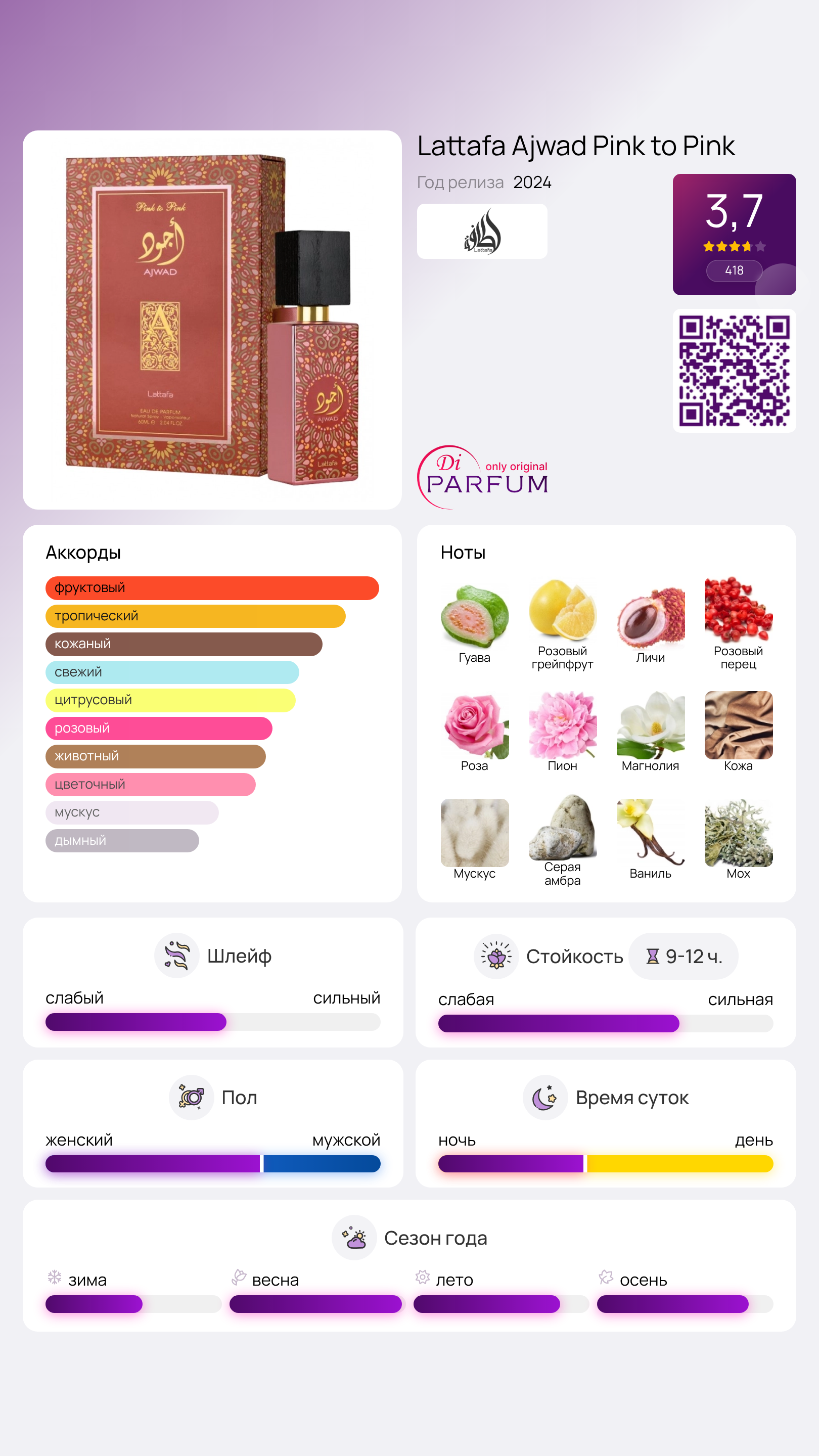 Lattafa Ajwad Pink to Pink – это изысканный аромат с пряными нотами, который создан на основе мультифруктового сока, где основную роль играет грейпфрут, и розы в стиле Montale, что добавляет нотку роскоши, напоминающей кожаный салон автомобиля премиум-класса.