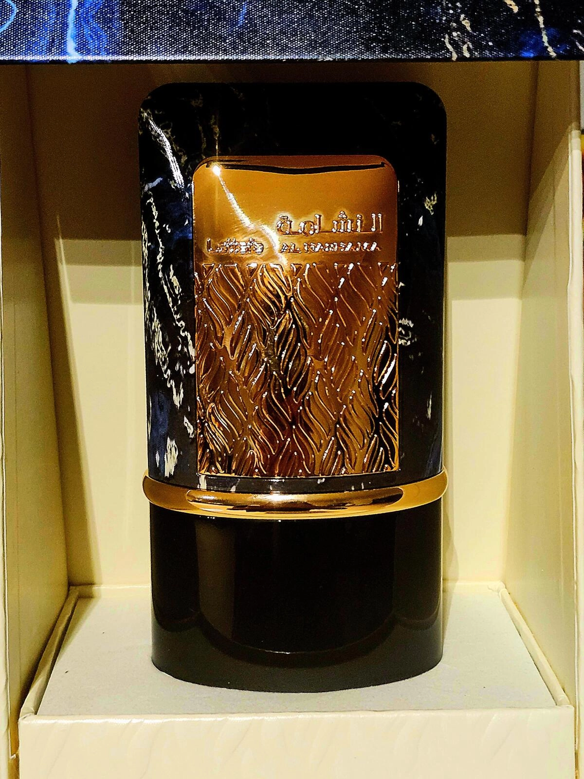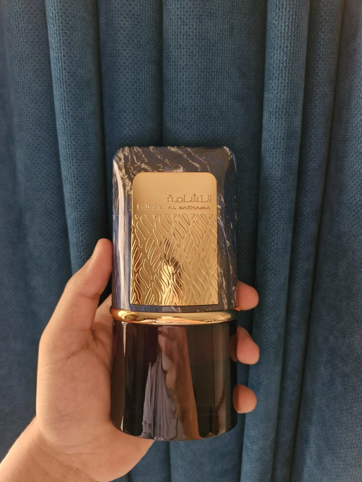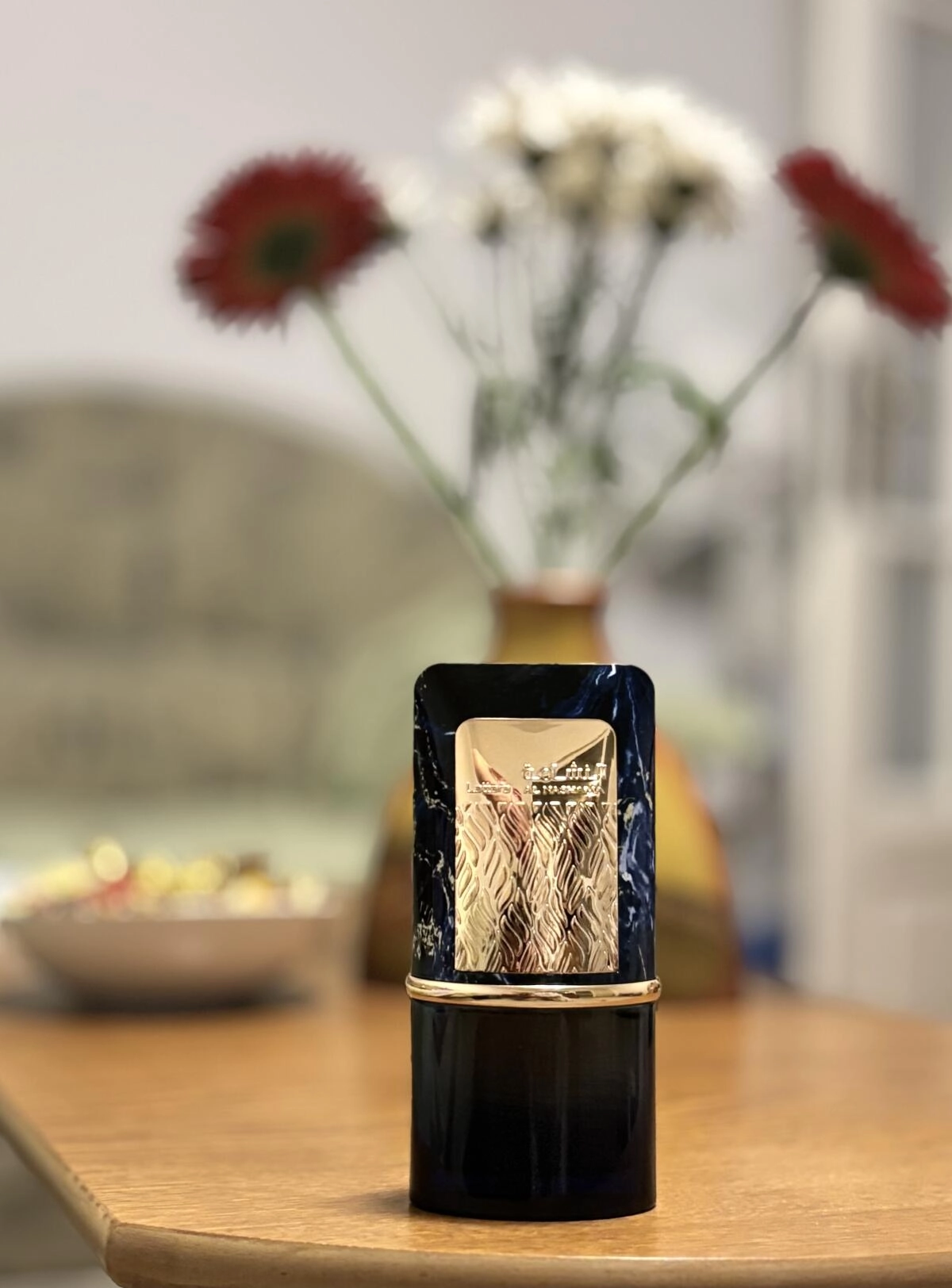 Парфюм Lattafa Al Nashama Caprice, ставший ярким событием 2023 года, заслуживает особого места в вашей коллекции ароматов, жизни и, безусловно, в вашем сердце! Обратите внимание на его флакон - он выглядит как монолит, укутанный в различные оттенки синего и завершающийся скошенной крышкой, на которой размещена золотая табличка с названием и оригинальным узором.