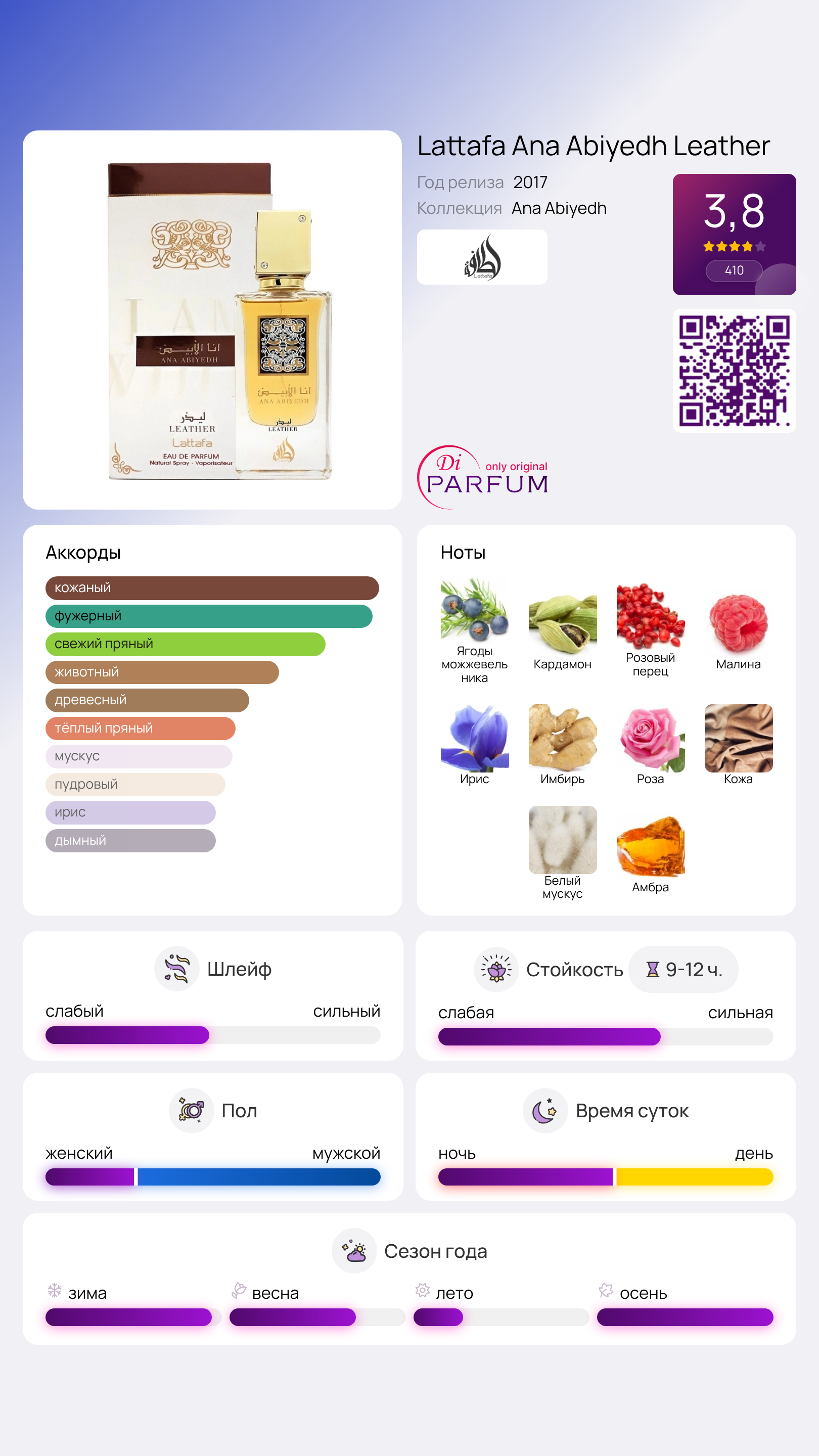 Аромат Lattafa Ana Abiyedh Leather включает в себя ноты лимона, ветивера, пачули, белого мускуса и кожи. Теплая и мягкая композиция завершается утонченным и стойким шлейфом. Lattafa Ana Abiyedh Leather подходит для любых жизненных ситуаций.