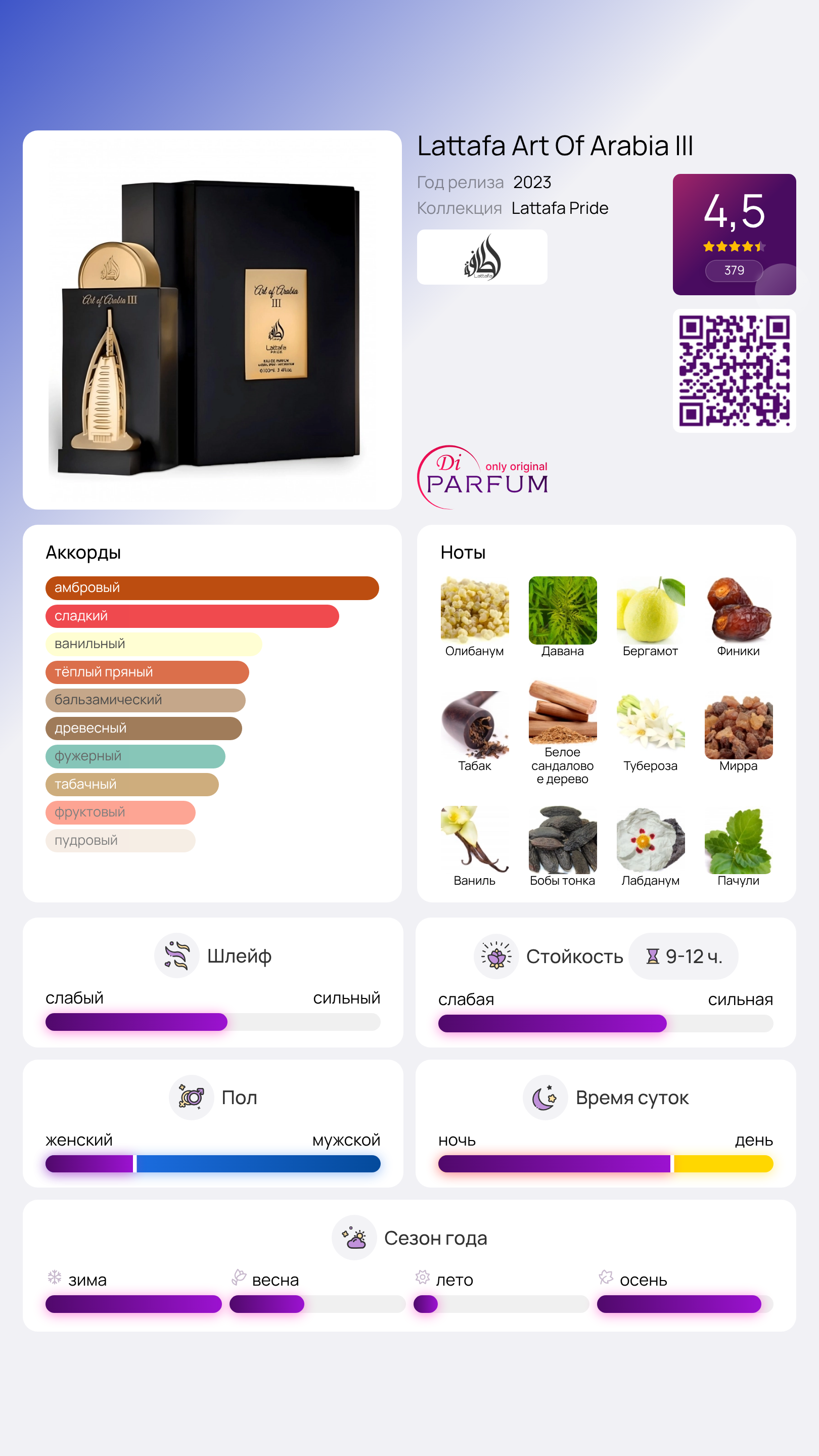 Душистый табак дополняет общую тональность аромата, а янтарный лабданум усиливает его глубину. Формула Art Of Arabia III от Lattafa предназначена для мужчин и женщин, ценящих артистический подход к парфюмерии в арабском стиле. Этот парфюм был выпущен известным брендом из ОАЭ в 2023 году как часть премиум линии Pride, олицетворяющей утонченную роскошь Востока.