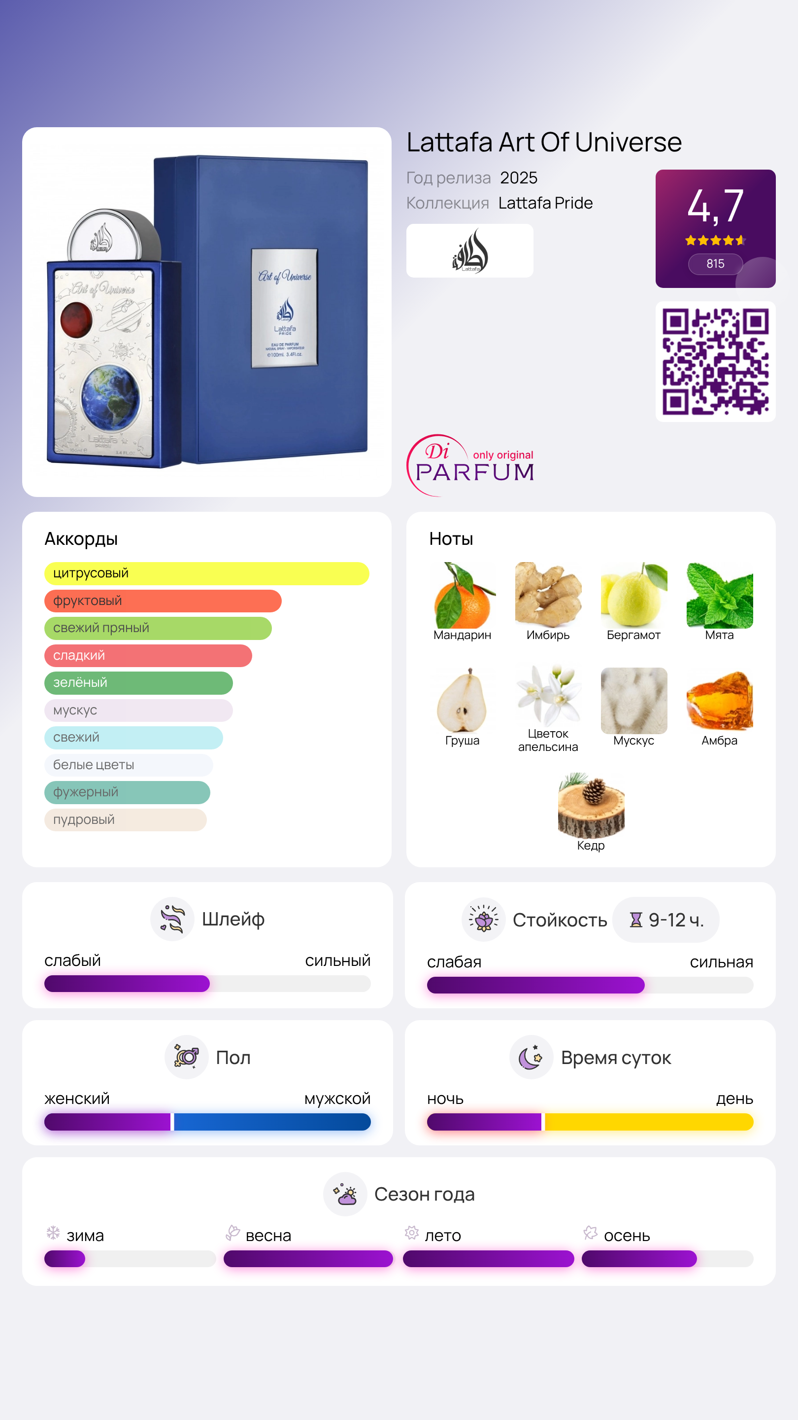 Art Of Universe от Lattafa Perfumes — это цитрусово-ароматический парфюм для мужчин и женщин, который был представлен в 2025 году. Этот новый аромат погружает в атмосферу свежести и гармонии, идеально подходя как для повседневного использования, так и для особых случаев.