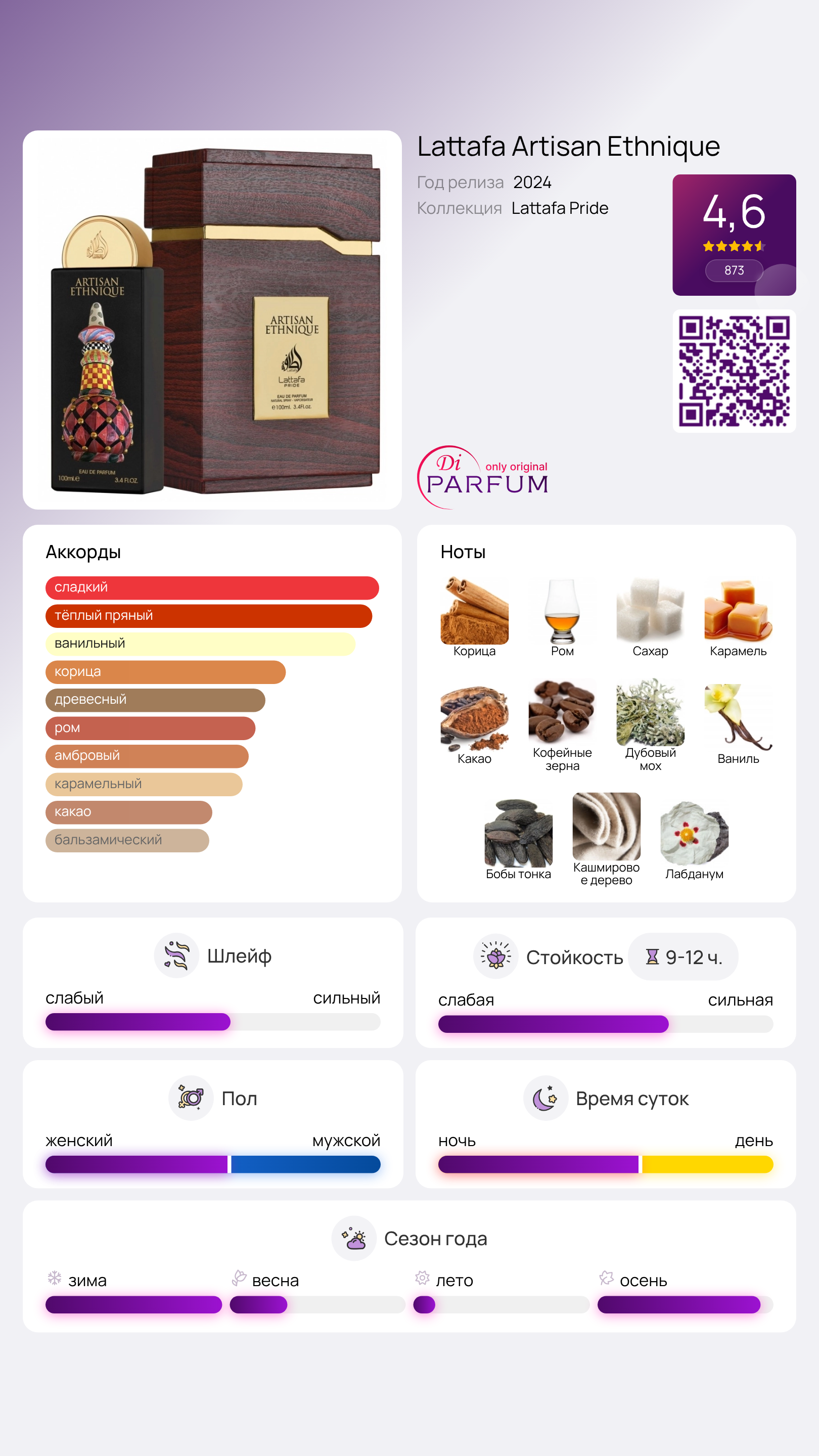 Artisan Ethnique – это идеальный выбор для тех, кто ценит утонченность и сладость в своих ароматах. Будь то самостоятельное использование или в сочетании с другими парфюмами, этот аромат станет настоящей находкой для вашей коллекции.