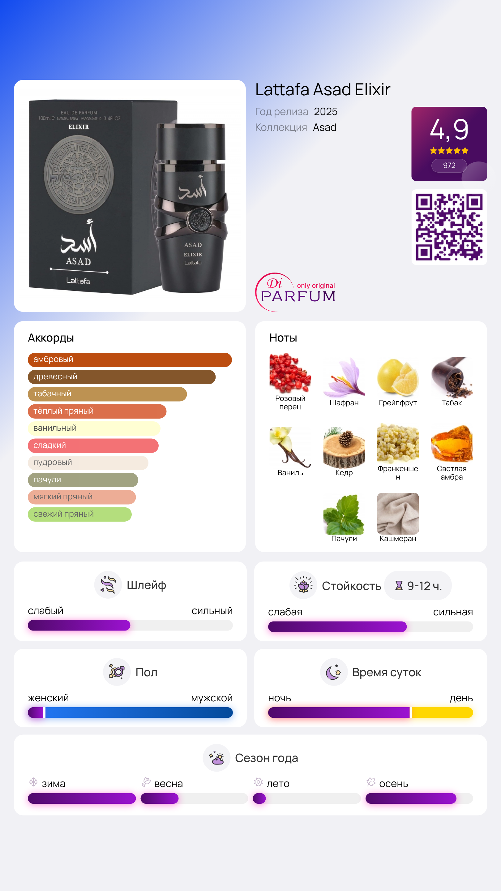 Asad Elixir от Lattafa Perfumes — это восточный аромат для мужчин, представленный в 2025 году. Он является новой интерпретацией оригинального аромата Asad, который погружает вас в мир высокой ноты контрастов, страсти и утонченности.