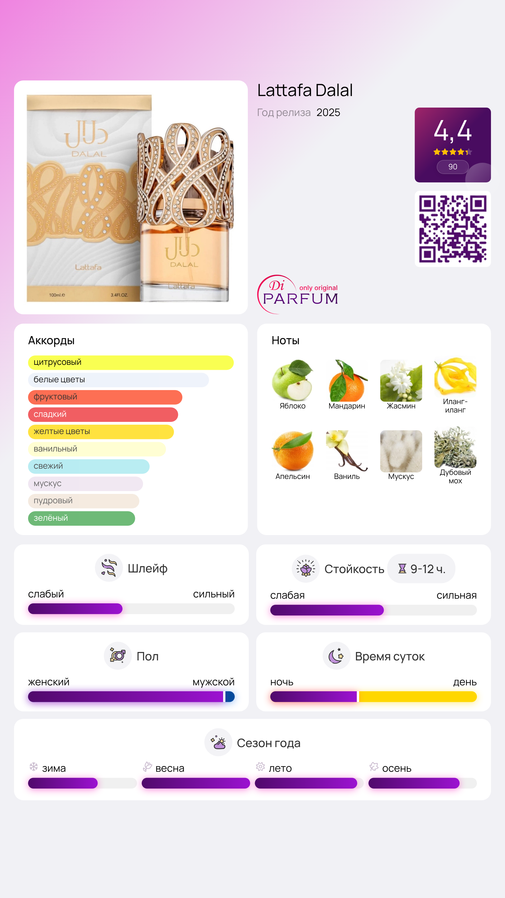 Dalal от Lattafa Perfumes – это цветочно-фруктово-гурманский аромат для женщин. Верхние ноты представлены освежающим яблоком и мандарином, которые создают яркое начало, переходящее в цветочное сердце из жасмина, иланг-иланг и апельсина. В базе аромата уютно разливаются ваниль, мускус и дубовый мох, создавая сладкий, слегка пудровый и нежно мшистый характер, что делает его поистине женственным и комфортным.