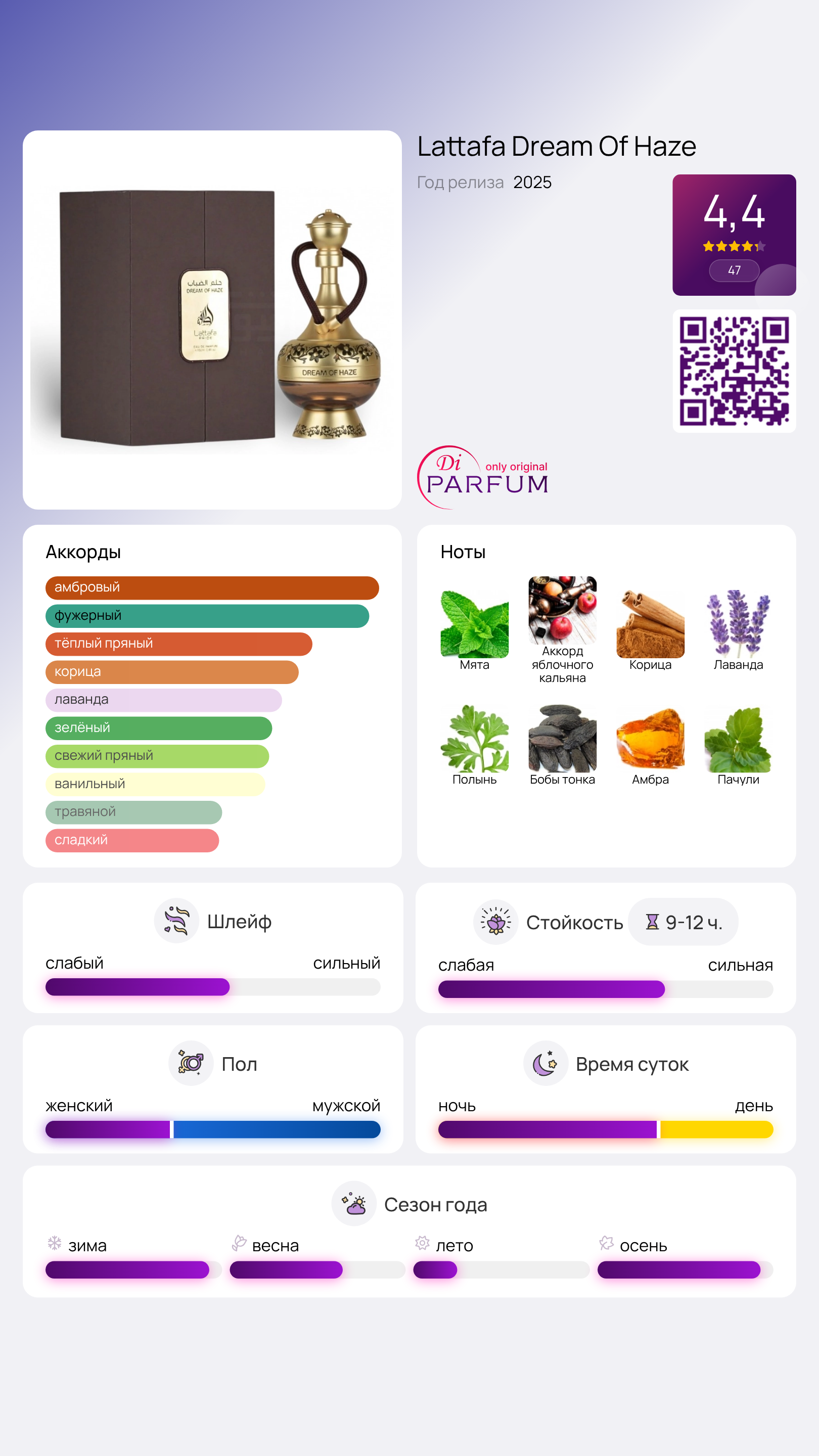 Dream Of Haze от Lattafa Perfumes – это восточно-фужерный аромат, предназначенный как для женщин, так и для мужчин. Верхние ноты состоят из освежающей мяты и сладкого яблока в сочетании с аккордом шиша. В сердце аромата раскрываются пряная корица, успокаивающая лаванда и травяная артемизия. Завершающие ноты формируются глубоким пачули, теплой амброй и бархатными бобами тонка.