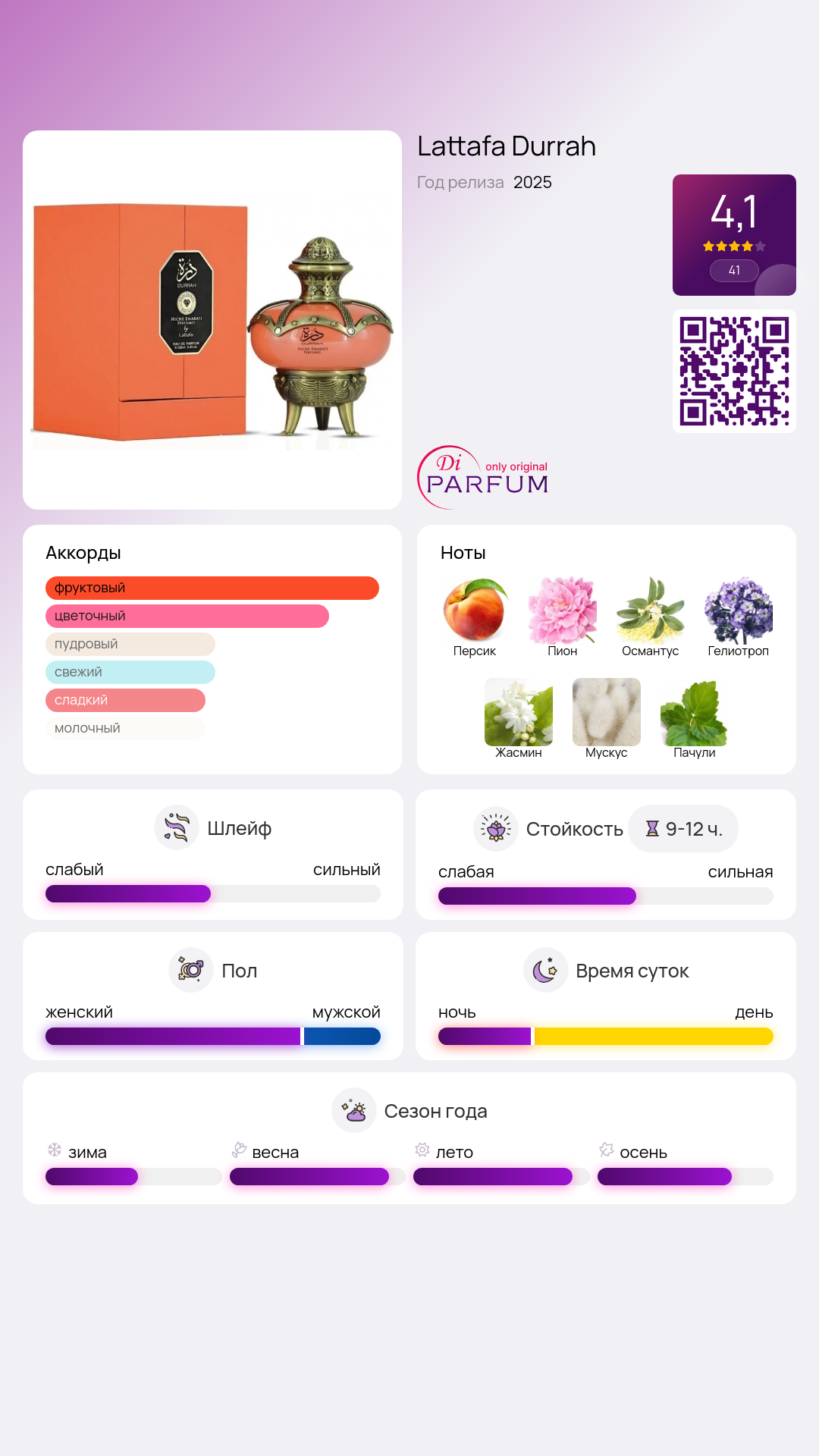 Durrah идеально подходит для использования в любое время года и станет великолепным дополнением к вашему образу, подчеркивая индивидуальность и вкус. Погрузитесь в мир чувственности и роскоши с этим уникальным выполнением от Lattafa Perfumes.