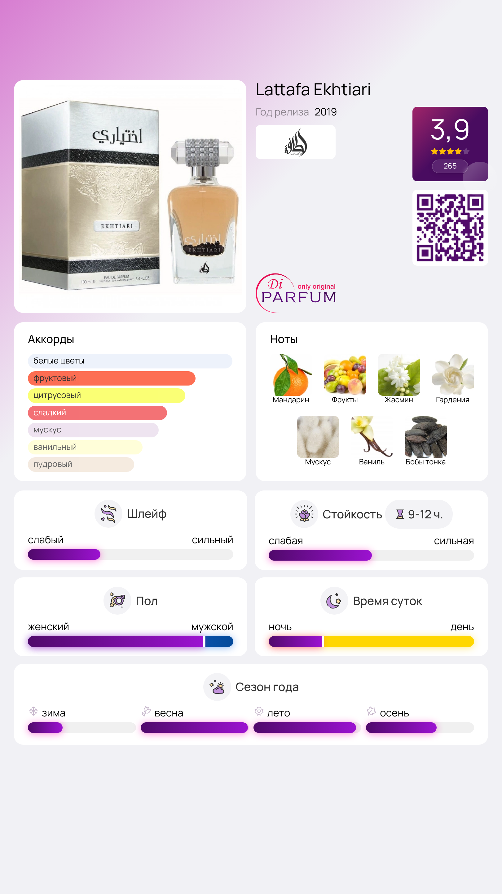 Кроме индивидуальных ароматов, компания предлагает роскошные подарочные наборы и композиции для создания атмосферы в доме. Один из их популярных продуктов —Lattafa Ekhtiari, представляющий собой элегантный парфюм в традиционном восточном исполнении. Этот аромат проявляет стойкость, насыщенность и оставляет шлейф. В его формуле можно найти фруктовые и цитрусовые ноты, включая сочный мандарин и спелую дыню, а базу составляют солнечная янтарная амбра и кедр.