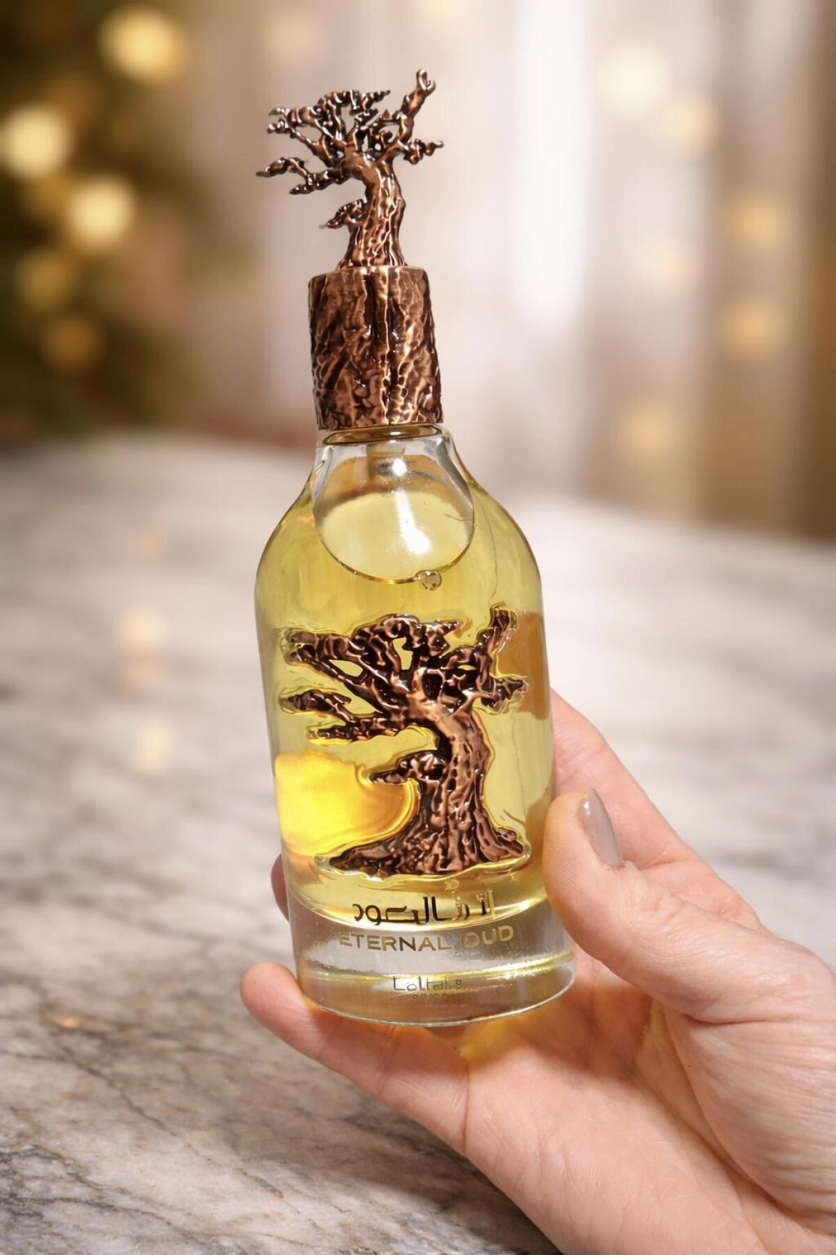 Среди ароматов, которые приобретаются не только ради их потрясающего запаха, но и для эстетического наслаждения, особое внимание привлекает новинка 2022 года — арабский парфюм Lattafa Eternal Oud. Если не знать о его назначении, флакон можно легко принять за элемент интерьёрного дизайна, ведь он выглядел бы прекрасно в любом пространстве. Декор елегантно отражает дух композиции, восхваляющей силу агарового дерева, с его изображением на стеклянном флаконе с сатиновым покрытием и мини-копией на крышке, которая, подобно корням, опирается на холодный металл.
