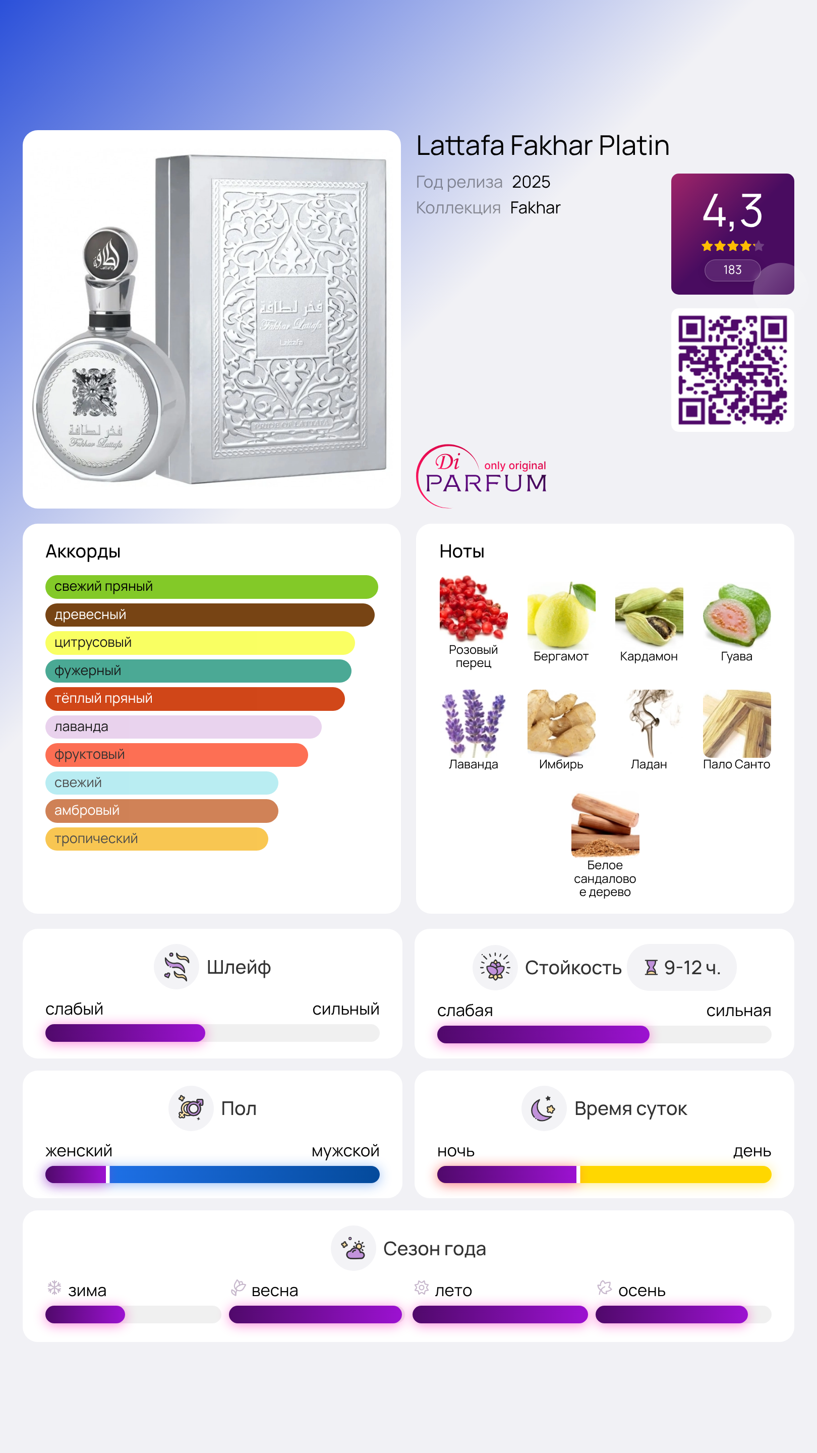 При глубоком раскрытии аромата вы почувствуете загадочные ноты пало санто и сандалового дерева, окутанные дымным ладаном, которые создают эффект теплоты и мистичности. Fakhar Platin — это смелое выражение современности, идеальное для уверенных в себе личностей, ищущих в парфюме баланс между свежестью и элегантностью.