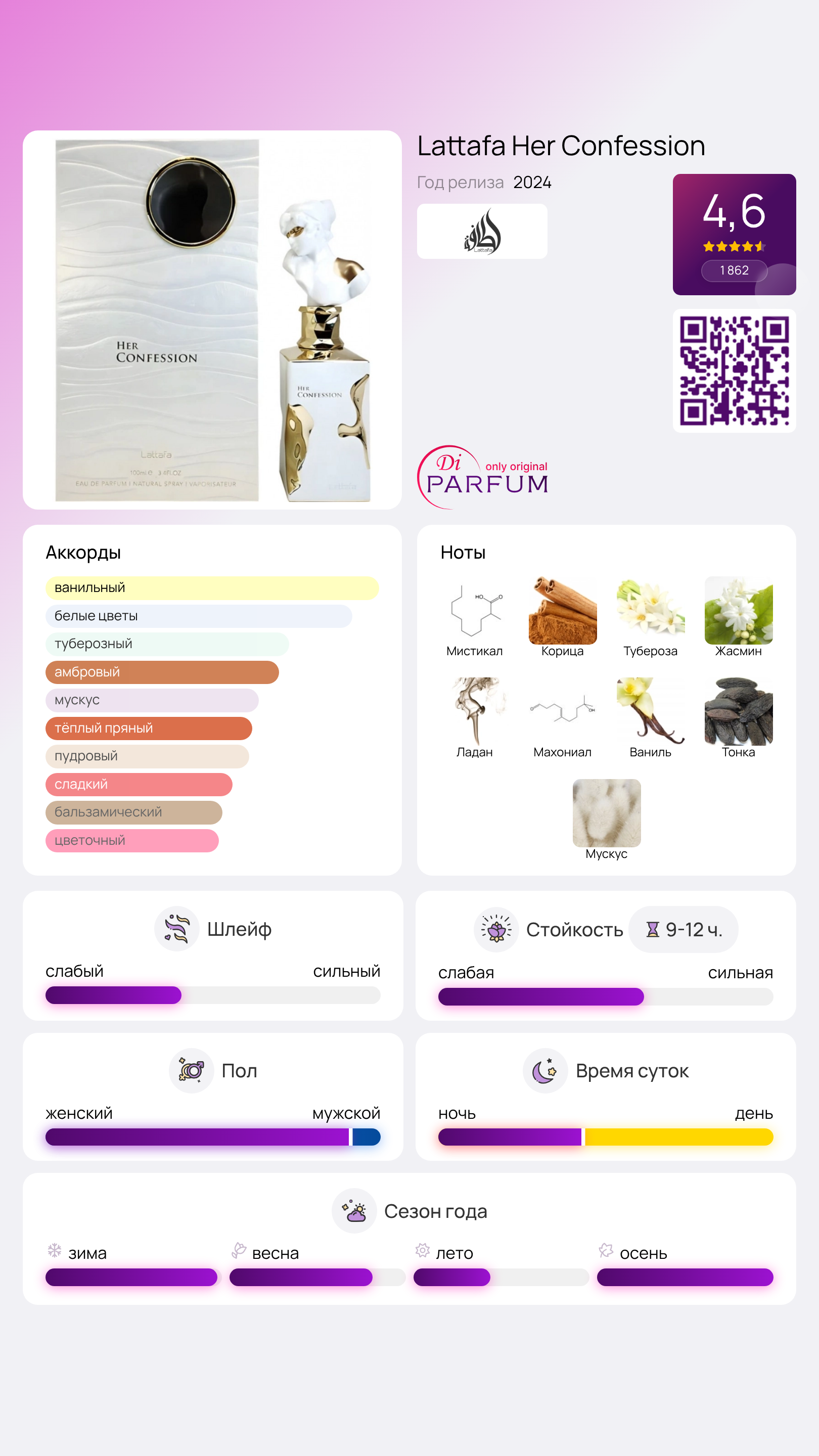 Her Confession от Lattafa Perfumes — это новый женский аромат, выпущенный в 2024 году. Он восхитительно сочетает в себе тепло, загадочность и элегантность. Начальные ноты представляют собой захватывающую смесь корицы и мистических аккордов, создавая интригующее и притягательное открытие.