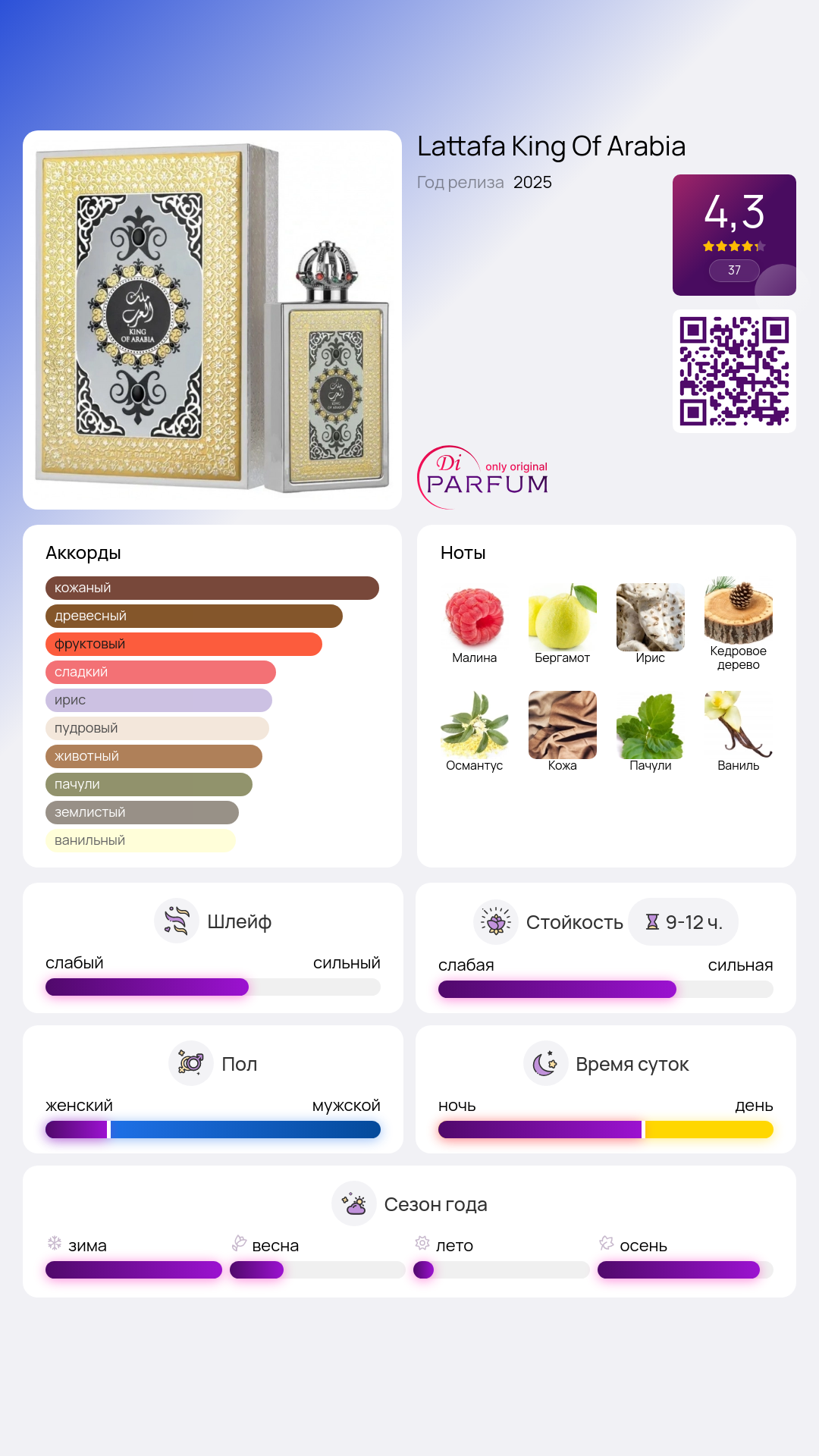 Финальные аккорды закрывают аромат великолепной комбинацией кожи, ванили и пачули, что придаёт ему глубину и характер. King Of Arabia идеально подходит для вечерних выходов и важных мероприятий, подчеркивая вашу индивидуальность и стиль.