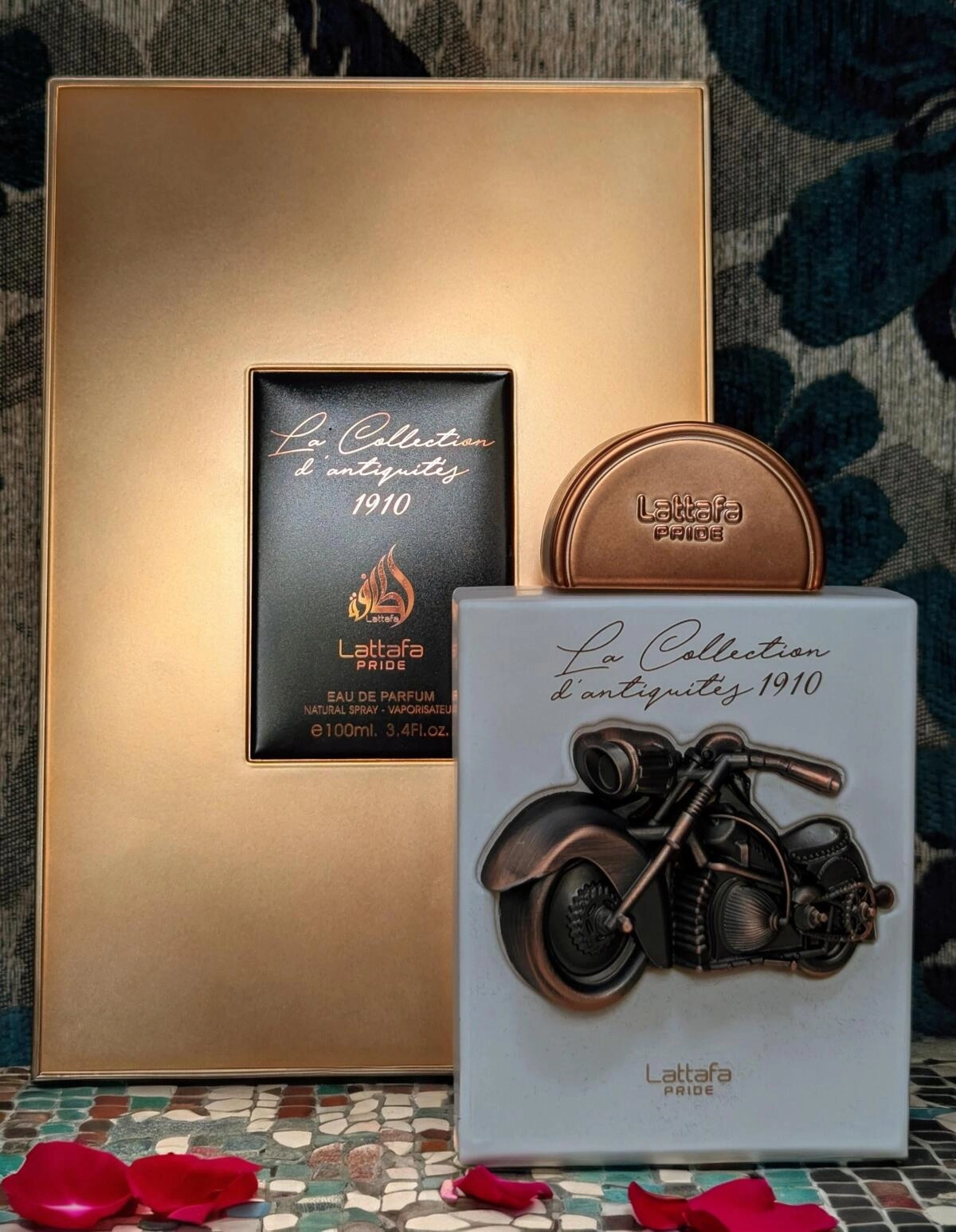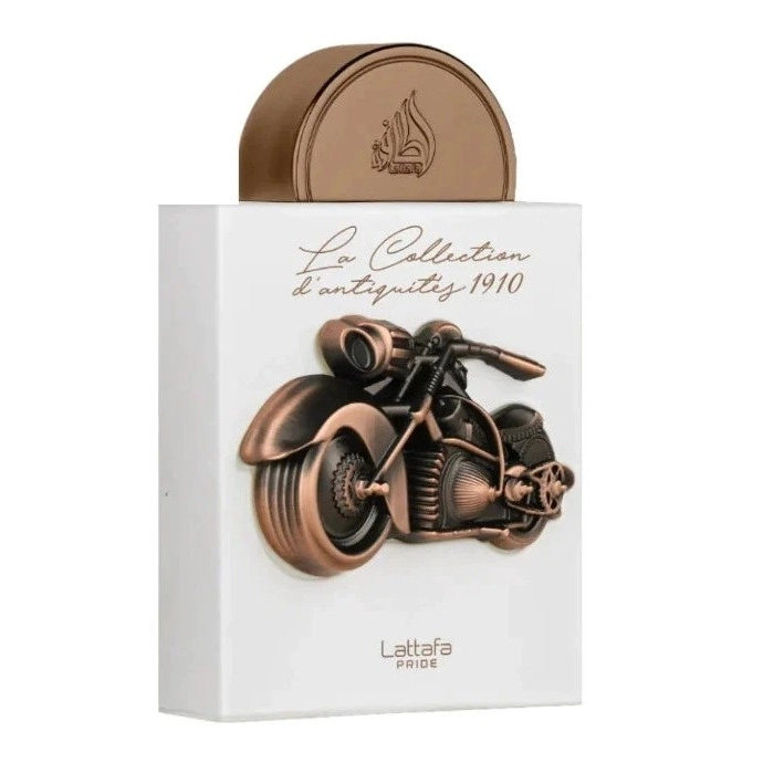 Lattafa La Collection D'antiquites 1910 представляет собой аромат, сочетающий цветочные и древесные ноты, новое видение для ценителей кедровых ароматов и бобов тонка. Этот парфюм посвящен антикварному мотоциклу, изображение которого находится на передней стороне флакона. Пирамида аромата перекликается с 1 Million Elixir.