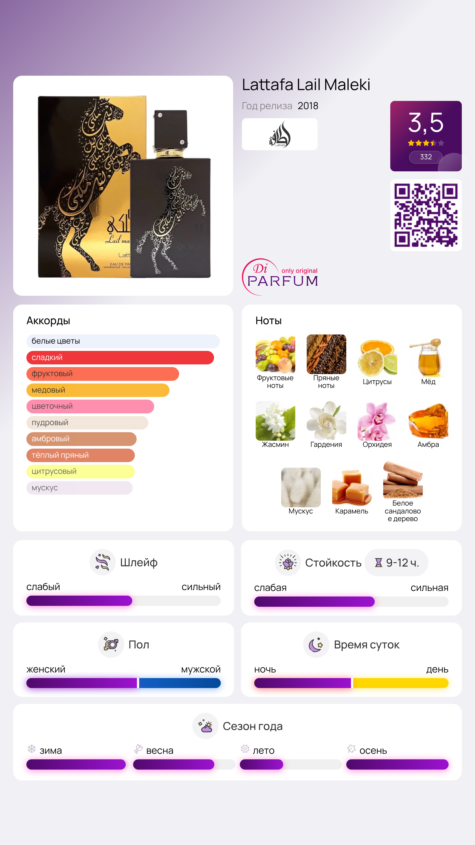 Одним из интересных предложений является Lail Maleki от Lattafa – уникальная композиция, в основе которой лежат ароматные цитрусовые ноты, фрукты, специи и древесные акценты. В верхних нотах этой пирамиды прекрасно сочетаются цитрусы, специи и фруктовые оттенки. В сердце композиции выделяется сладкий мед, который гармонично дополняется нотами орхидеи, гардении и жасмина. В базе ароматов доминируют сандал, амбра и мускус, а карамель добавляет гурманский акцент.