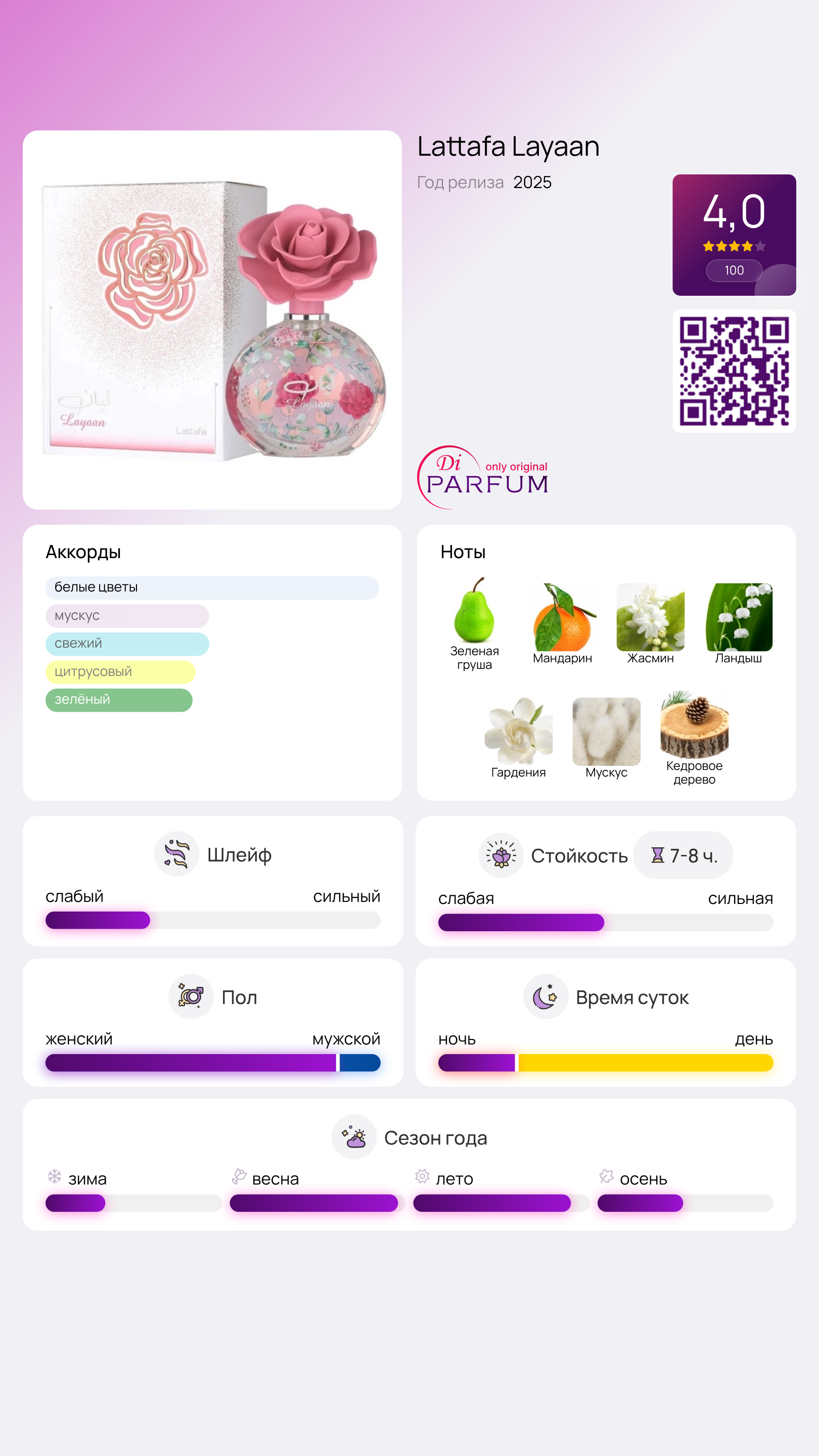 Layaan от Lattafa Perfumes - это цветочно-фруктовый аромат для женщин, который покоряет своей свежестью и женственностью. Этот новый парфюм был представлен в 2025 году и уже успел завоевать сердца многих дам.