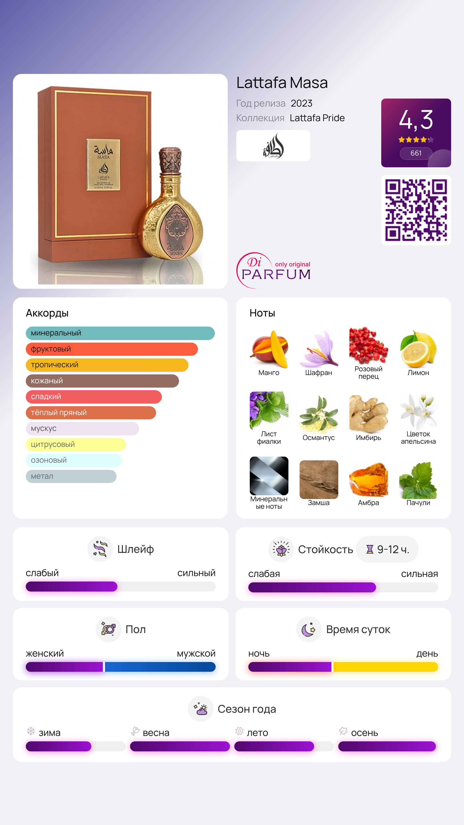 Нежная пудра, спадающая с листьев фиалки, прокладывает путь к базовым нотам Lattafa Masa, где бархатистая замша обвивает прозрачные минеральные компоненты телесных и солоноватых оттенков, усиливая соблазнительное звучание янтарной и смолистой амбры.