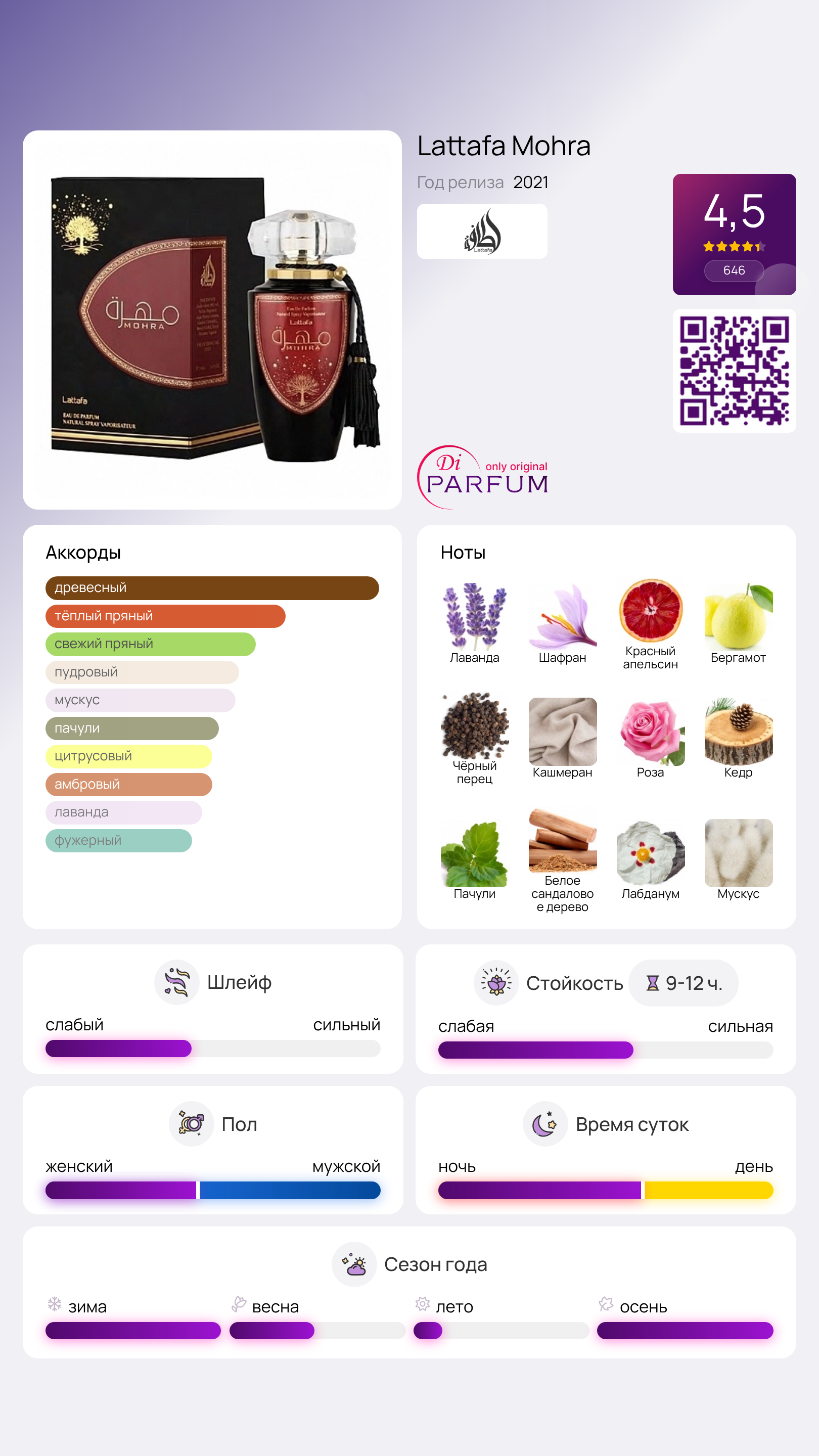 Презентованный в 2021 году, парфюм Mohra от Lattafa олицетворяет роскошь и утонченность арабской парфюмерии. Удивительным образом он демонстрирует мужественность на коже мужчин и соблазнительную женственность на женщинах. Черный флакон оформлен в восточном стиле с золотыми узорами и алой кисточкой, добавляя ему особый шарм.