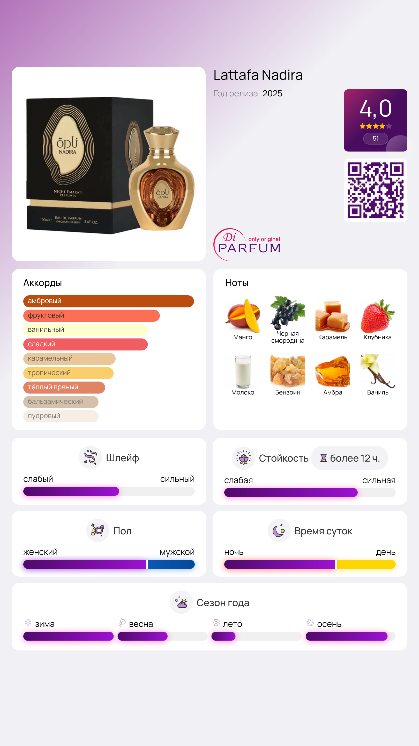 Nadira идеально подойдет для романтического вечера или особого случая, а также в повседневной жизни, добавляя каплю экзотики и шарма. Этот парфюм — отличный выбор для тех, кто стремится выделиться из толпы и делиться своим уникальным стилем.