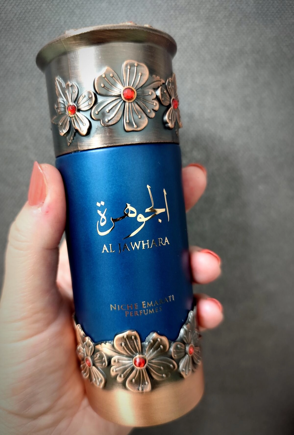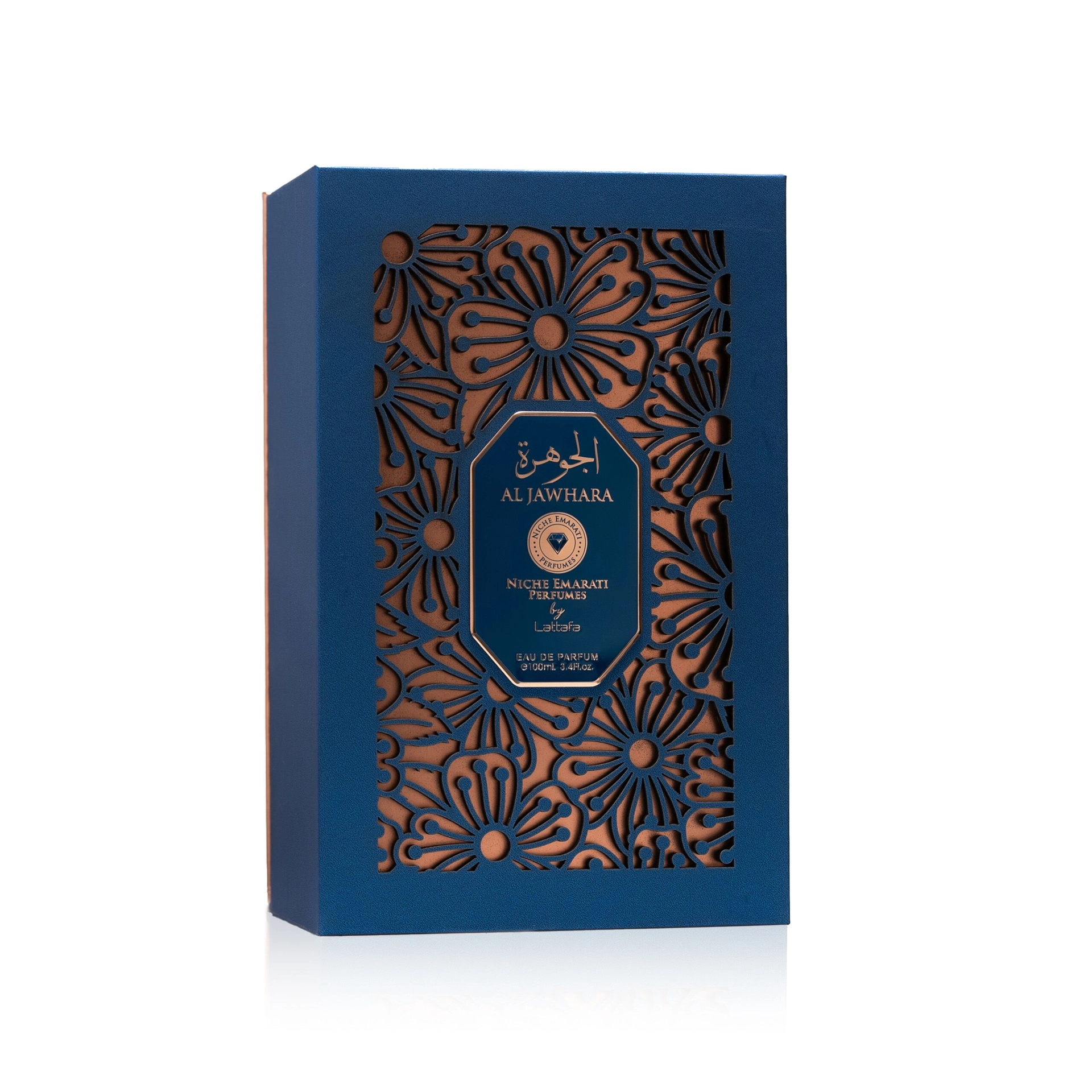 Концентрация эфирных масел придает композиции стойкость, что делает Niche Emarati Al Jawhara выдающимся примером в сегменте нишевой парфюмерии. Аромат подходит как мужчинам, так и женщинам, ценящим восточные ароматы. Флакон темно-синего цвета в виде цилиндра напоминает ювелирное произведение. Он изысканно оформлен объемными цветами, «под старинную медь», а сердце флакона дополнено красными кристаллами. Упаковка в виде декоративной шкатулки с резными узорами завершает этот роскошный продукт.
