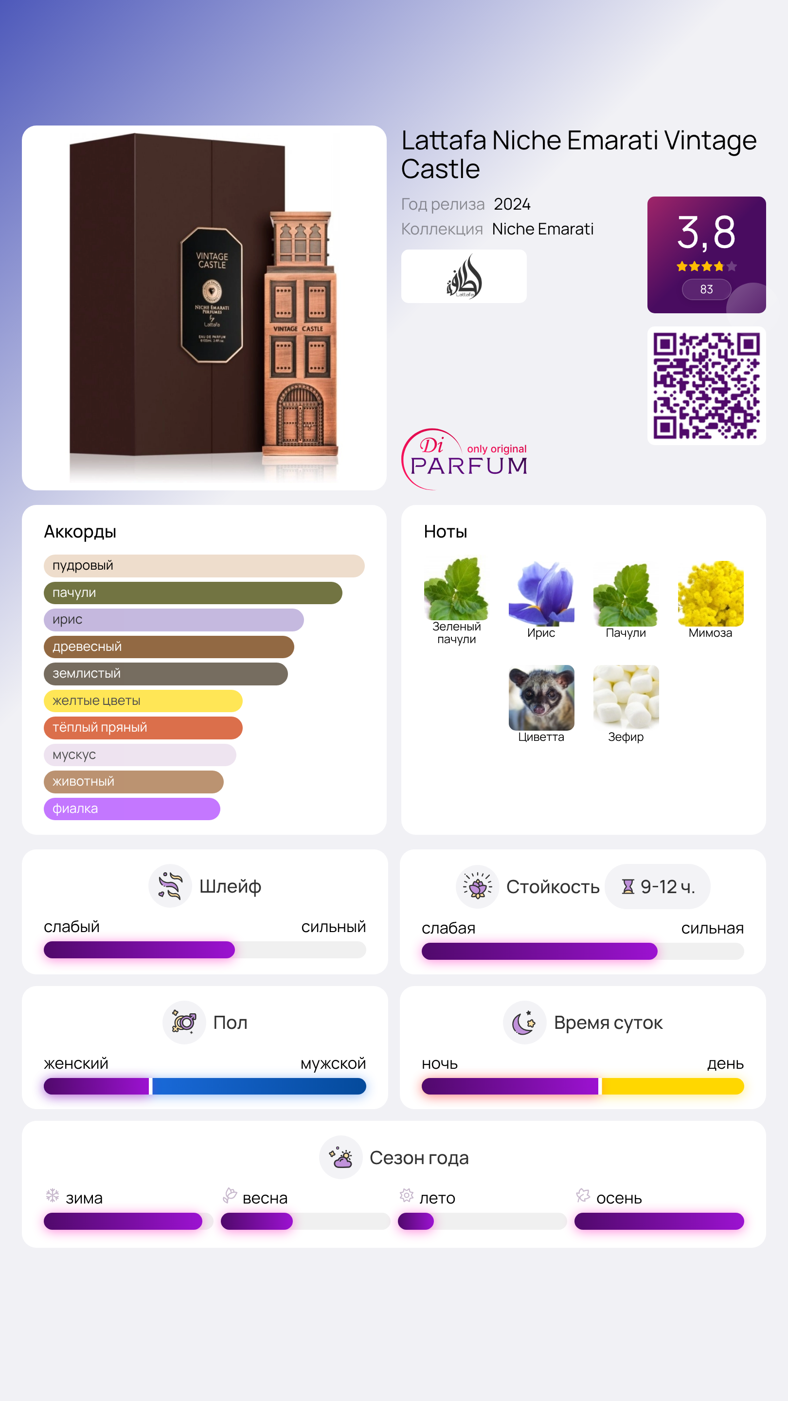 В финале пачули придают аромату неожиданную теплоту и уют благодаря сладости зефира, создающего объемное и воздушное звучание. А добавление анималистической ноты цибетина делает шлейф более глубоким и сложным. Vintage Castle от Lattafa Niche Emarati является ярким примером привлекательности популярной ноты пачули в парфюмерии. Этот аромат прекрасно подойдет как для повседневного ношения, так и в особых случаях, добавляя вашему образу изысканный шарм.