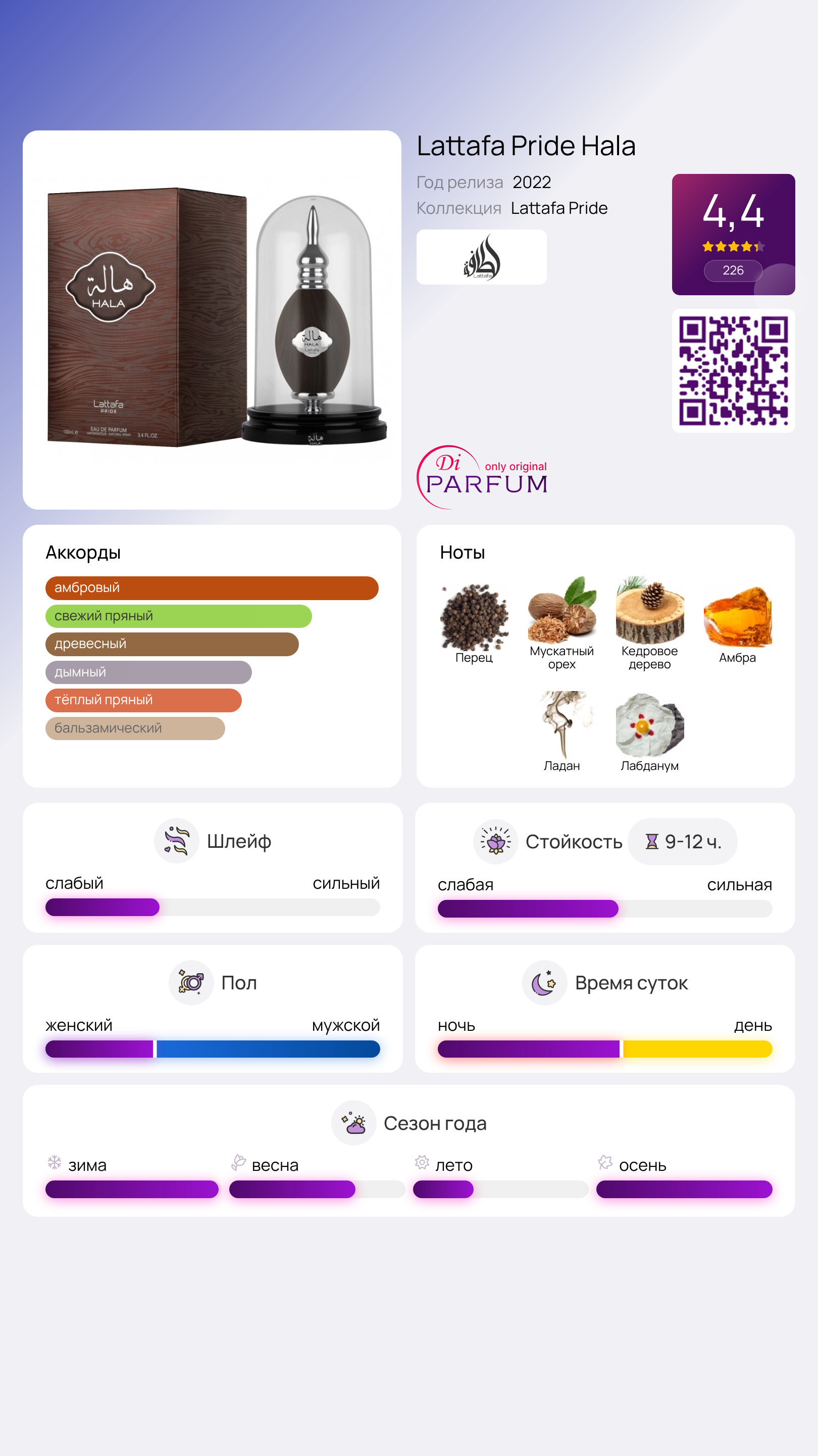 Парфюмерная продукция Pride Hala, разработанная арабским брендом Lattafa, представляет собой чувственный и восхитительный аромат, относящийся к восточно-древесной, пряной группе. Запущенный в 2021 году, этот аромат является современным интерпретацией классики парфюмерии.
