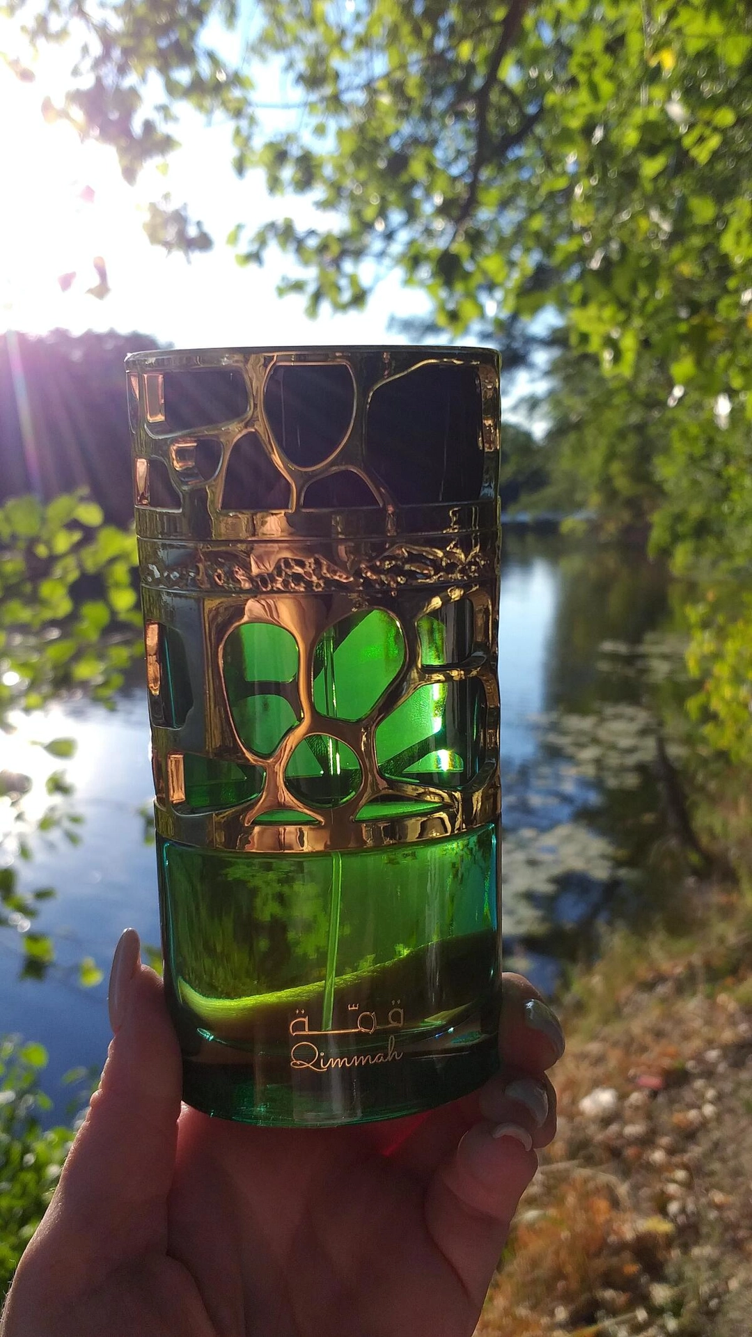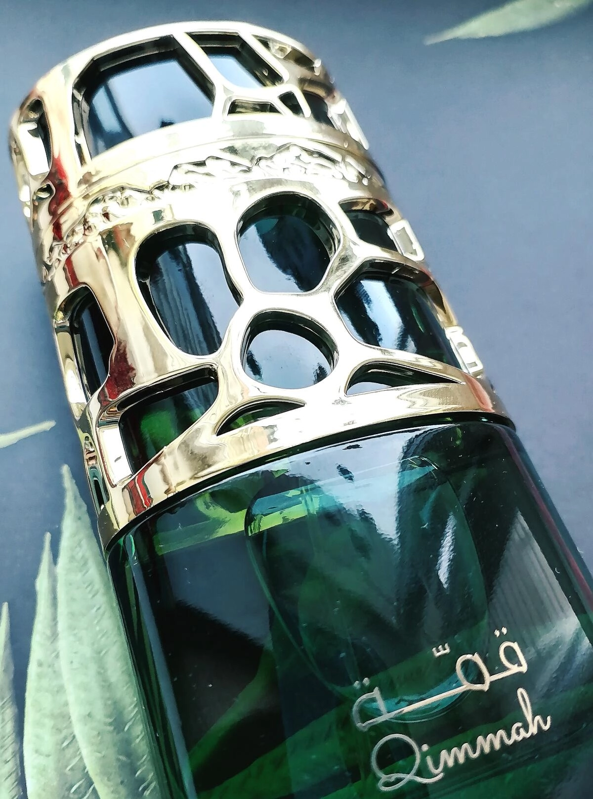 Флакон, выполненный в изумрудном цвете и украшенный золотистой металлической вязью, придает Qimmah For Women от Lattafa особую привлекательность и истинный восточный характер.