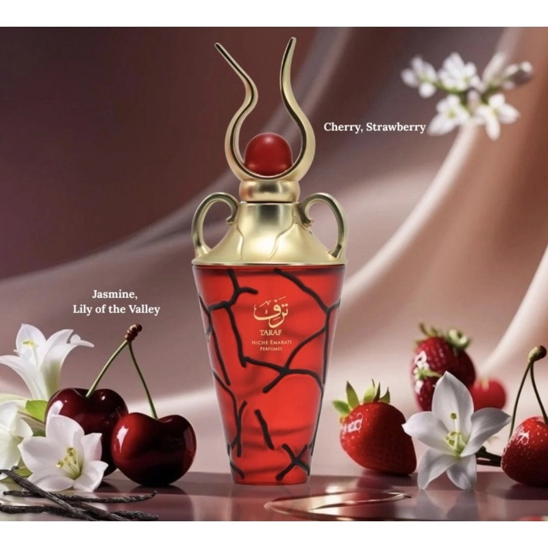 В верхних нотах Taraf звучат вишня и клубника, которые придают аромату сладкий и фруктовый старт. Сердце составляют изысканные ноты жасмина и ландыша, создающие цветочную гармонию. Завершают композицию теплые базовые ноты амбры, ванили и мускуса, придающие аромату насыщенность и стойкость.