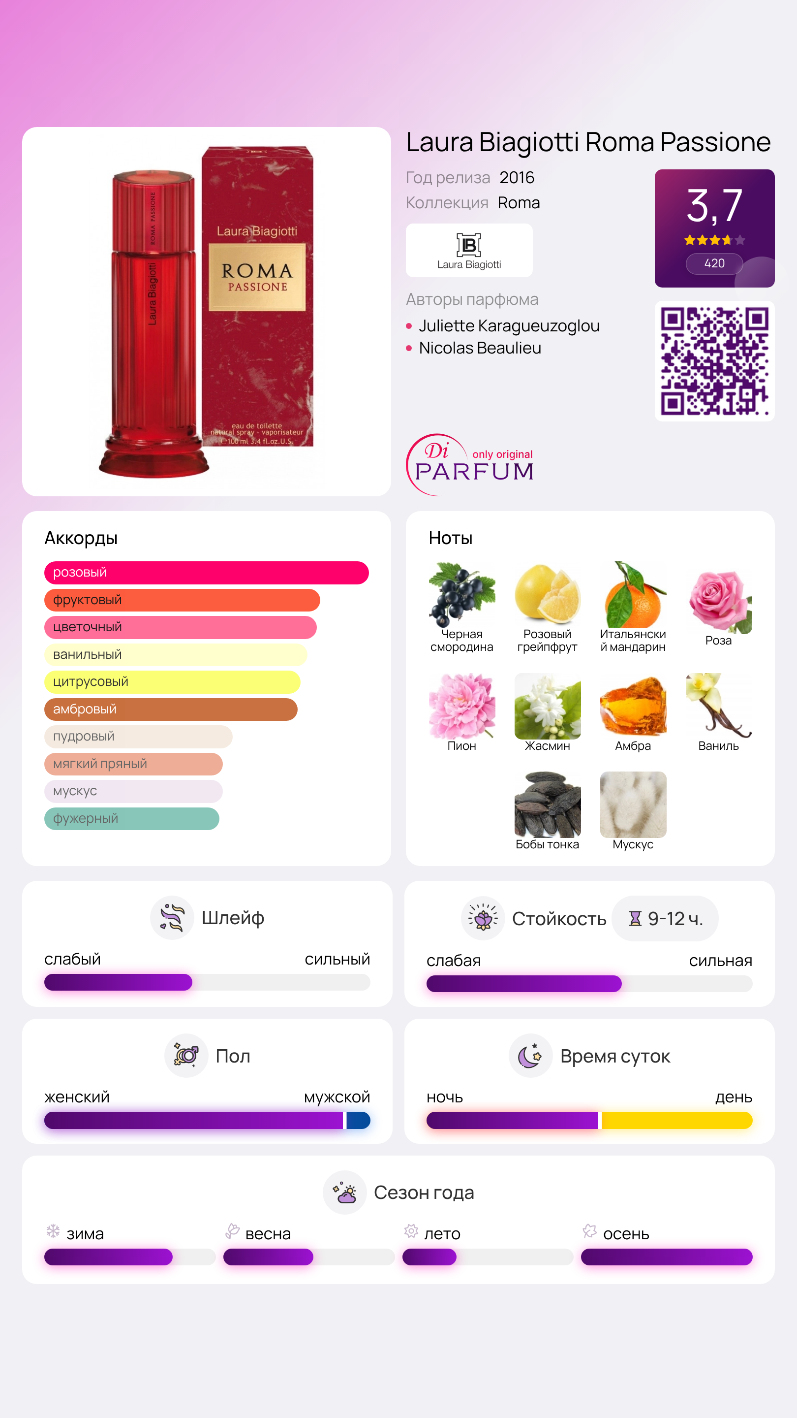 Посещение Рима наполнит вас незабываемыми впечатлениями, особенно если поездка будет связана с романтическими переживаниями — такие воспоминания останутся с вами навсегда. Идею создания парфюма для женщин Roma Passione разработала итальянский дизайнер Лаура Бьяджотти, а ее воплощение доверилиJuliette Karagueuzoglou и Nicolas Beaulieu.