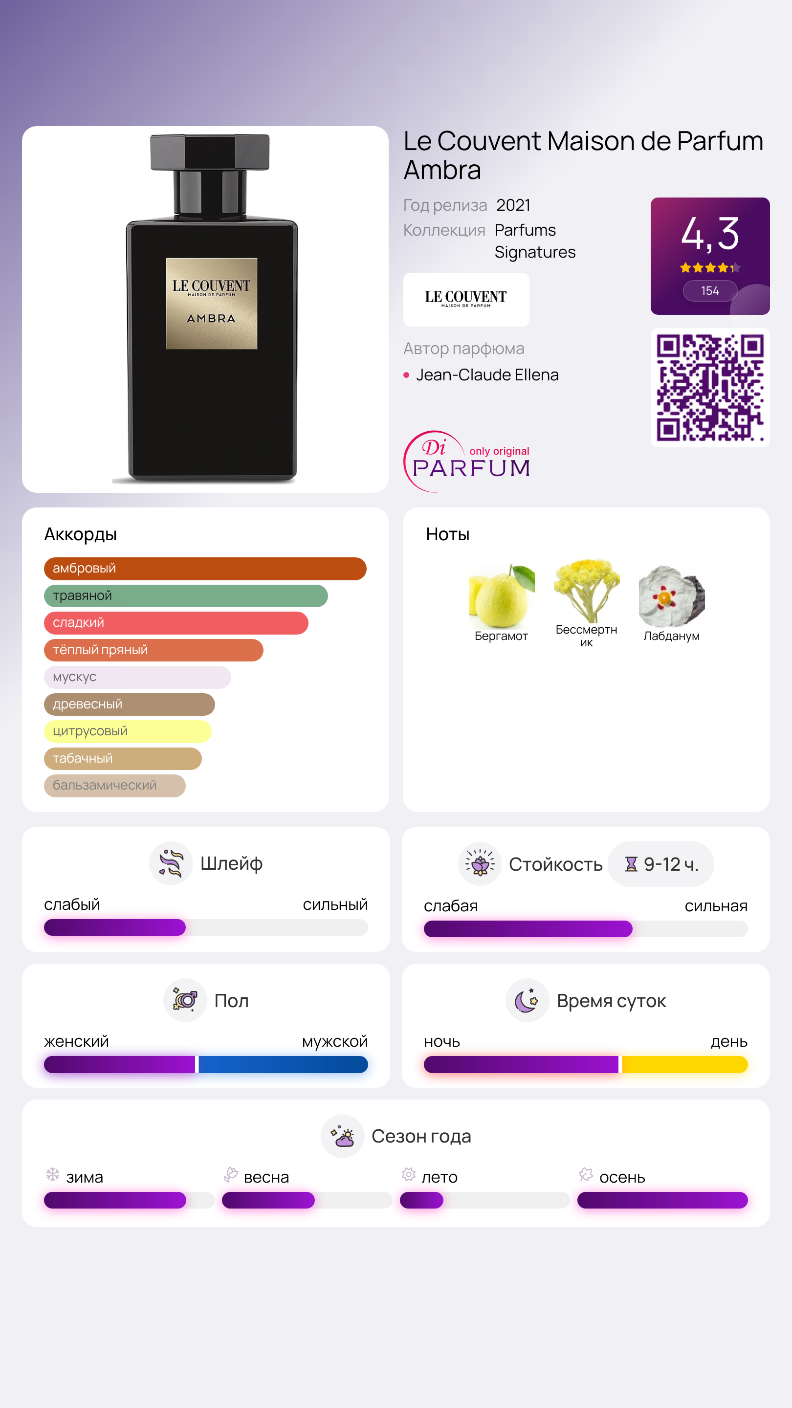 Чистая концентрированная амбра, насквозь пропитанная анималикой, стала особой персоной статуса VIP, приглашенной Эленой Жан Клодом на особых условиях в композицию Le Couvent Maison de Parfum Ambra. Черный флакон, украшенный золотой табличкой с названием, магически скрывает свое содержание и обладает темной, завораживающей харизмой. Этот аромат не для всех, он предназначен для избранных. Для тех, кто смел, чувствителен к эмоциям и умеет ценить настоящее. Аромат начинается прохладным и нейтральным, раскрываясь нотами бергамота – в них переплетаются свежий бриз Средиземноморья и аромат цитрусовых плантаций вдоль побережья. Внезапно появившийся бессмертник обвивает своими медовыми линиями, добавляя акцент маскулинности горячей кожи и восточной пряности утонченных соцветий. Лабданум, словно обжигающий огонь, придаёт аромату таинственность, раскрывая мускусные ноты и ведя к финальной черте Le Couvent Maison de Parfum Ambra, где правит только амбра. Она создает свое собственное королевство из минерально-соленых нюансов, наполненных воспомин