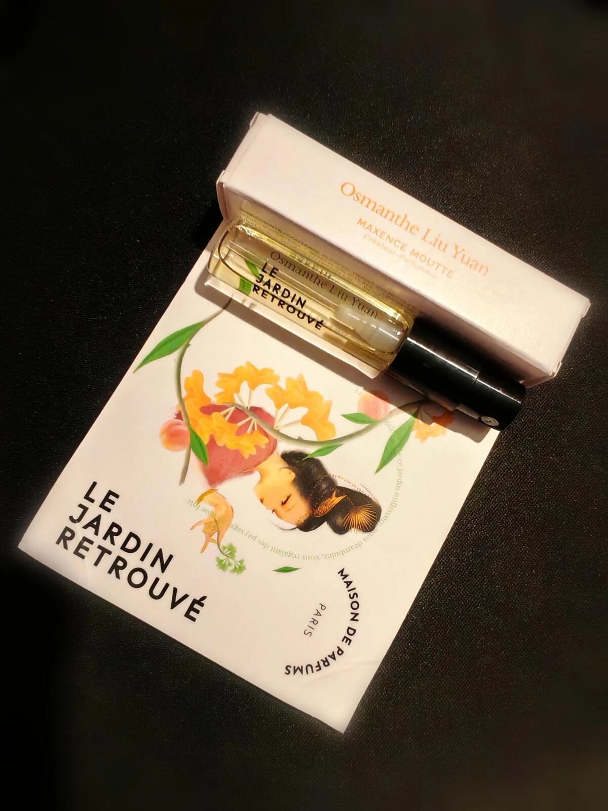 В центре композиции находятся османтисные цветы, искрящиеся желтыми и оранжевыми оттенками, которые завоевали симпатии многих китайцев. Эту пирамиду аромата составили из натуральных компонентов с долей около 90%. Максанс Мутт, вдохновленный своим детством в Провансе, стремился отобразить многогранность этого уникального цветка.