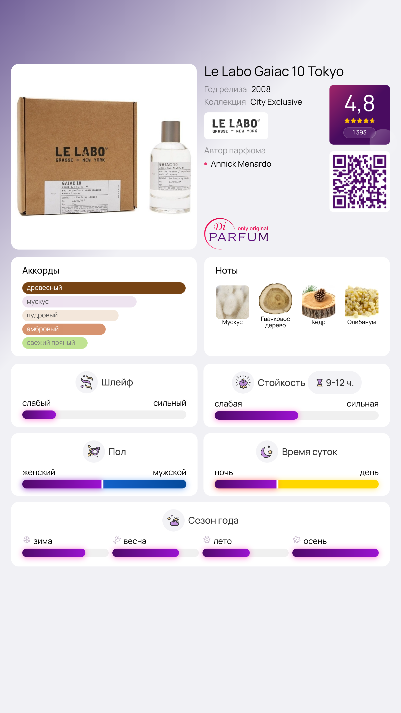 Флакон аромата Gaiac 10 Tokyo выполнен в традиционном стиле — это прозрачная, напоминающая аптечную бутылочка с простой наклейкой. Однако внутри скрывается изысканный и мягкий микс. Создатель Gaiac 10 Tokyo, нос Annick Menardo, использовала в его пирамиде очаровательный белый мускус, загадочный олибанум с его мистическим отливом, теплый сандал с кремовыми нюансами и экзотическую древесину гуаяк.