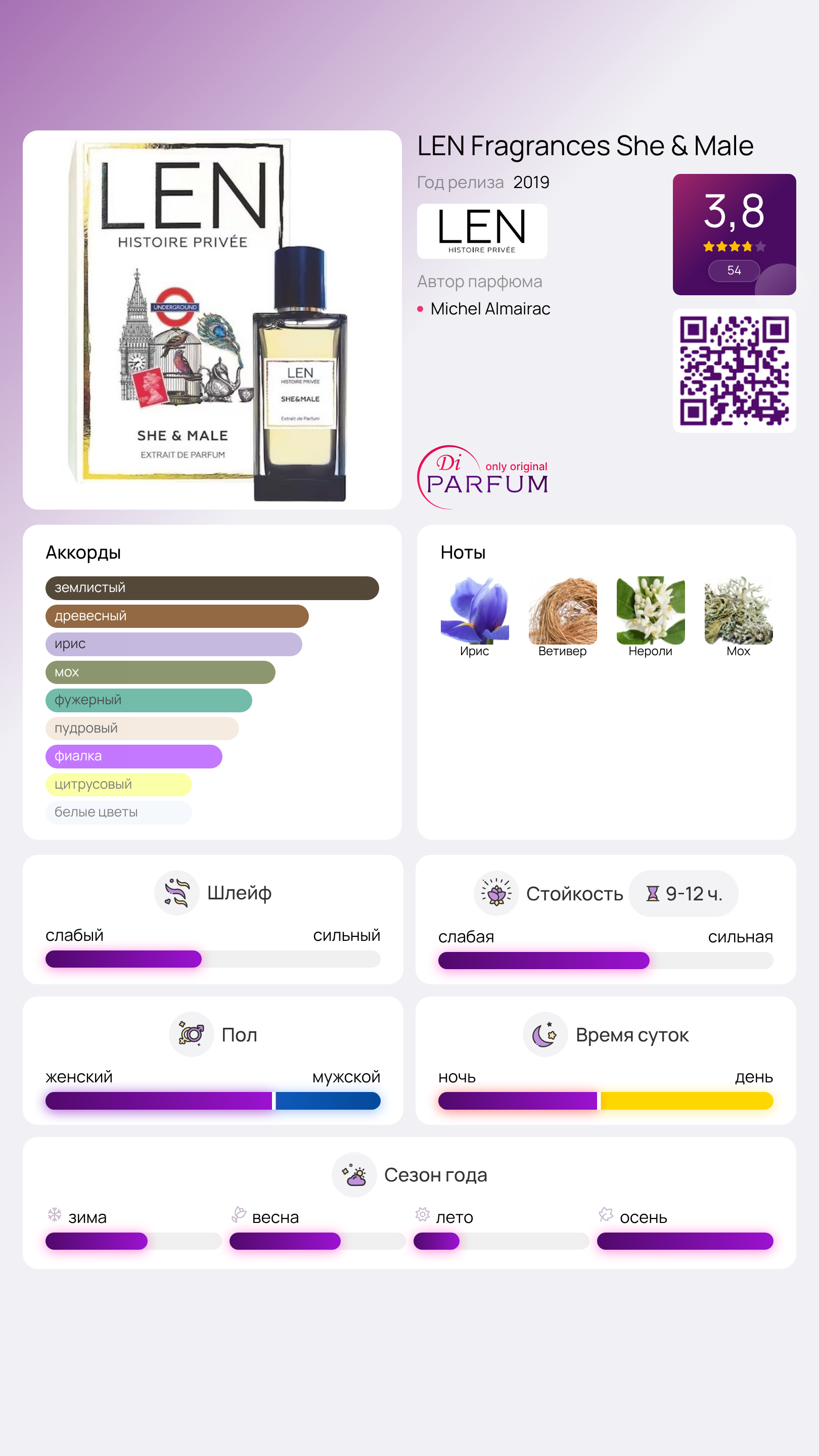 Завершающие аккорды мха добавляют аромату глубину и насыщенность, наполняя его землистыми и древесными оттенками. LEN Fragrances She & Male притягивает внимание своим уникальным звучанием и исключительной гармонией. Этот аромат подойдет для любого случая и станет завершающим штрихом к любому образу. Противоположности притягиваются, и в данной композиции они раскрывают свою волшебную гагрмонию, напоминая нам о великолепии и утонченности ириса.