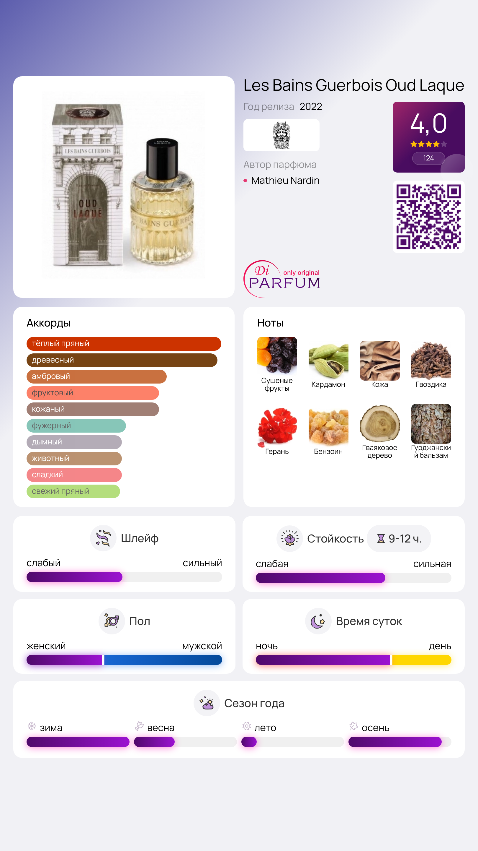 Смолистый бензоин добавляет сладость, похожую на ваниль, в экзотическую атмосферу гваяка, которая освежается травяными оттенками герани. Композиция Oud Laque от Les Bains Guerbois полна мифологических образов, способных вдохновлять и дарить умиротворение. Эти приятные духи прекрасно дополнят как мужской, так и женский стиль. Парфюмерная вода была представлена на выставке TWFA 2022 в Каннах от французского бренда.