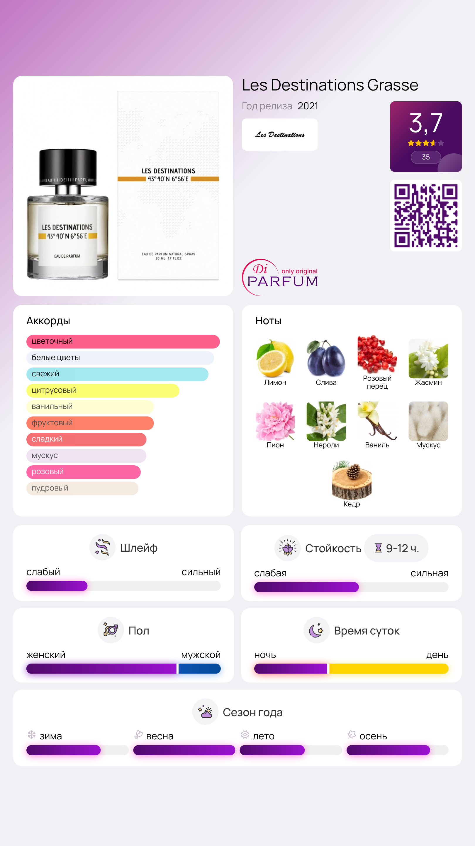 Обворожительный шлейф сочетает в себе сладость ванили и сочные ноты зрелой сливы. Сексуальная притягательность мускуса переплетается с благородными качествами кедра, что создаёт уникальный аромат. Композиция Grasse от Les Destinations – это оригинальный венок ярких объединенных нот, насыщенный любовью к парфюмерному искусству и многовековыми традициями. Искусное смешение нот побуждает ощущение гармонии. Этот новый аромат 2021 года был представлен американским брендом в рамках коллекции, вдохновленной глобальными путешествиями.