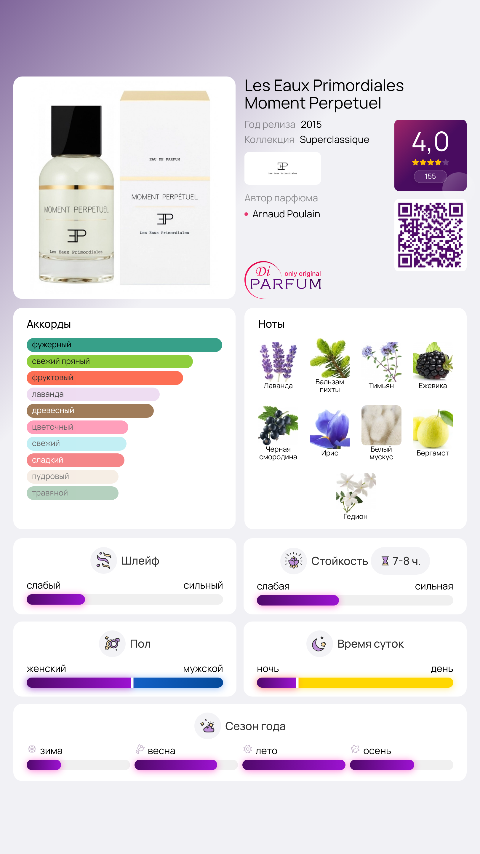 Аромат Les Eaux Primordiales Moment Perpetuel представляет собой захватывающий фужерный фруктовый букет, который создает ощущение вечного момента. Прикоснитесь к своей коже несколькими каплями, и время остановится на ваше усмотрение.
