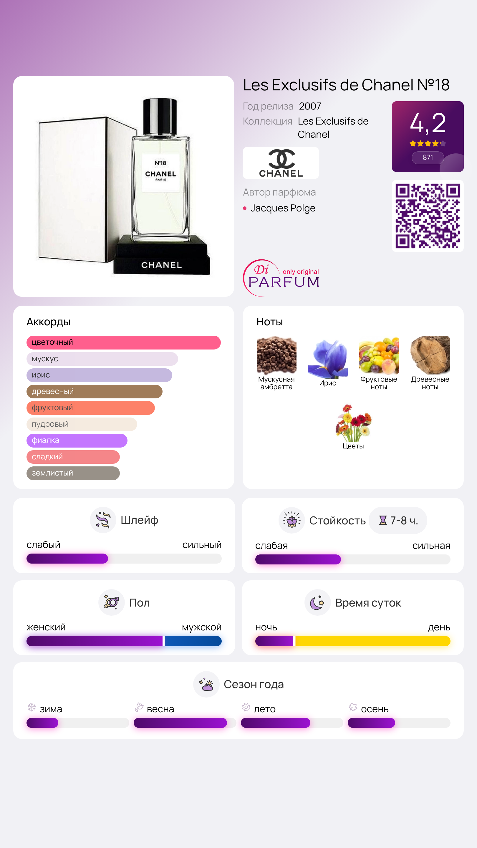 Концепция, заложенная в ароматы, заключалась в разработке необычных и уникальных композиций, которые значительно отличаются как друг от друга, так и от современных предложений на рынке парфюмерии. Среди ароматов, вошедших в серию Les Exclusifs de Chanel, можно выделить: Coromandel, 28 La Pausa, Bel Respiro, №18, 31, rue Cambon и Eau de Cologne. Аромат №18 представляет собой цветочно-древесную композицию, которая передает ощущение утренней свежести и серебристой росы в комфортном лесу, наполненном теплом июльского солнца, созданную на основе выжимки из семени амбретты.