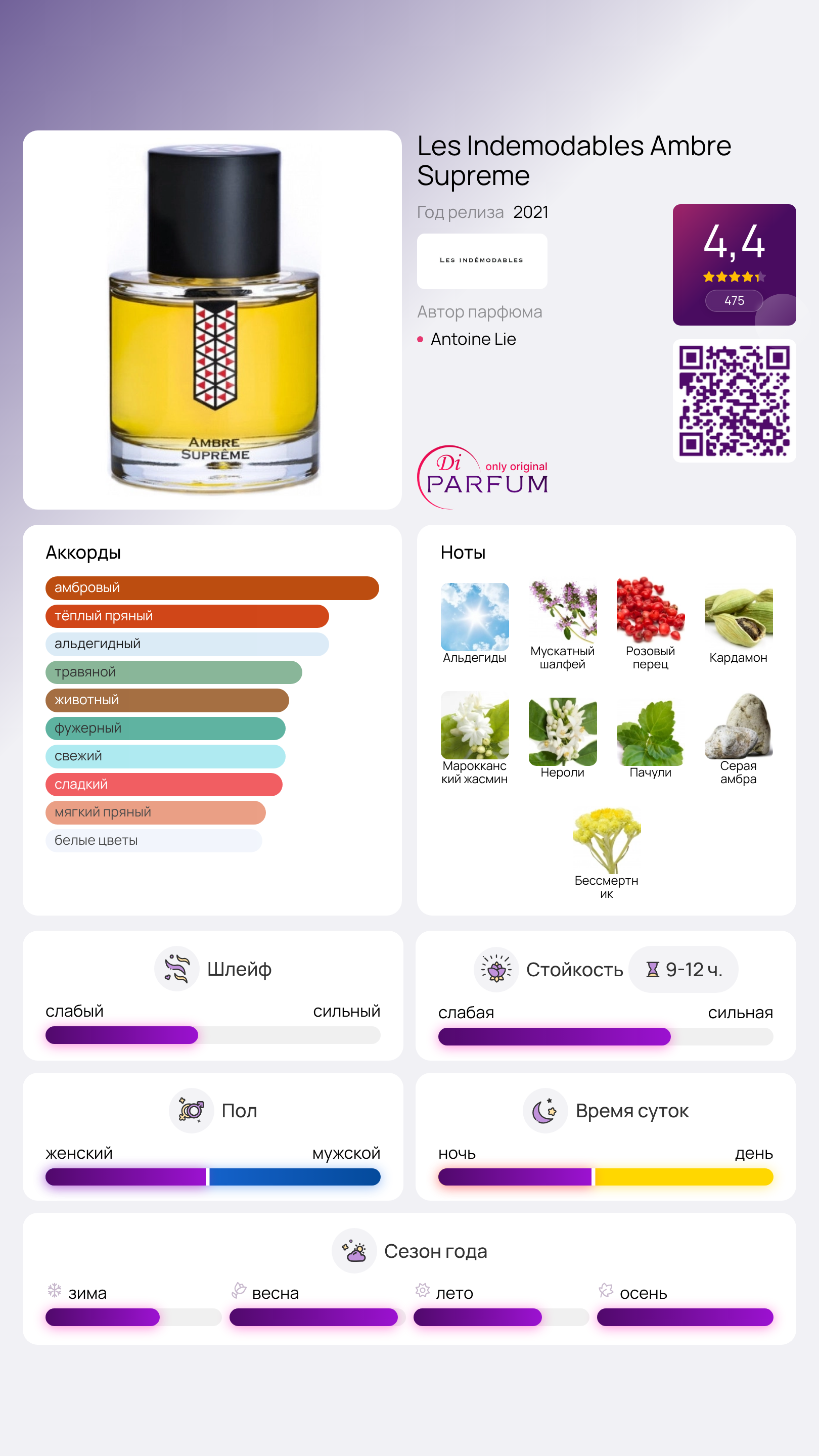 Ambre Suprême от Les Indemodables — это восточный аромат, который подходит как для женщин, так и для мужчин. Он был выпущен в 2021 году и создан талантливым парфюмером Антуаном Ли. Этот уникальный аромат отличается своей сложной композицией, которая сочетает в себе яркие и насыщенные ноты.