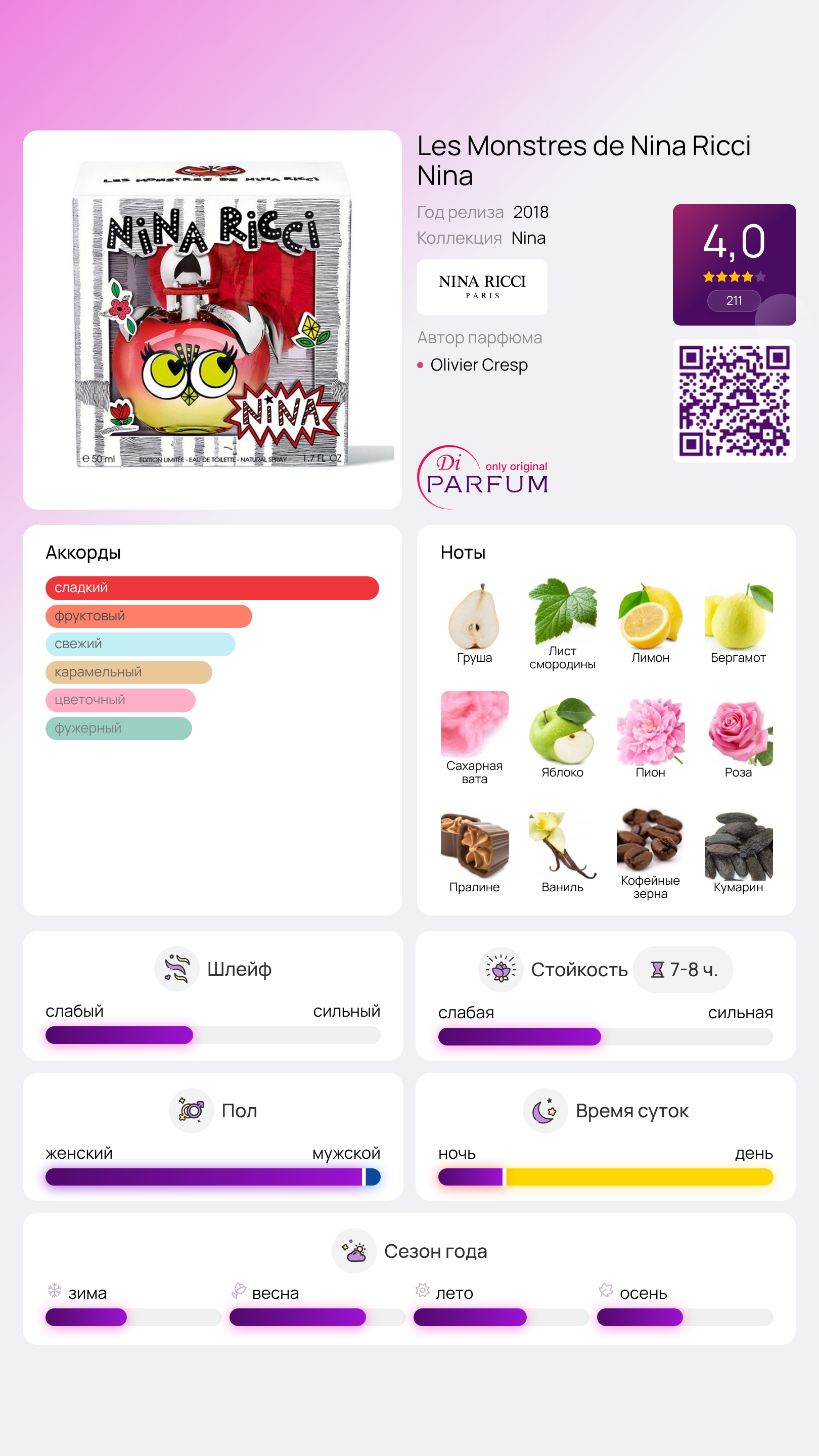 Фирменный флакон в форме яблока от Nina Ricci можно узнать даже в его "монстр" вариации. Парфюм Les Monstres de Nina Ricci Nina принадлежит к цветочно-фруктовой категории и был создан Оливье Крепсом для тех, кто любит сладкие и необычные ароматы.