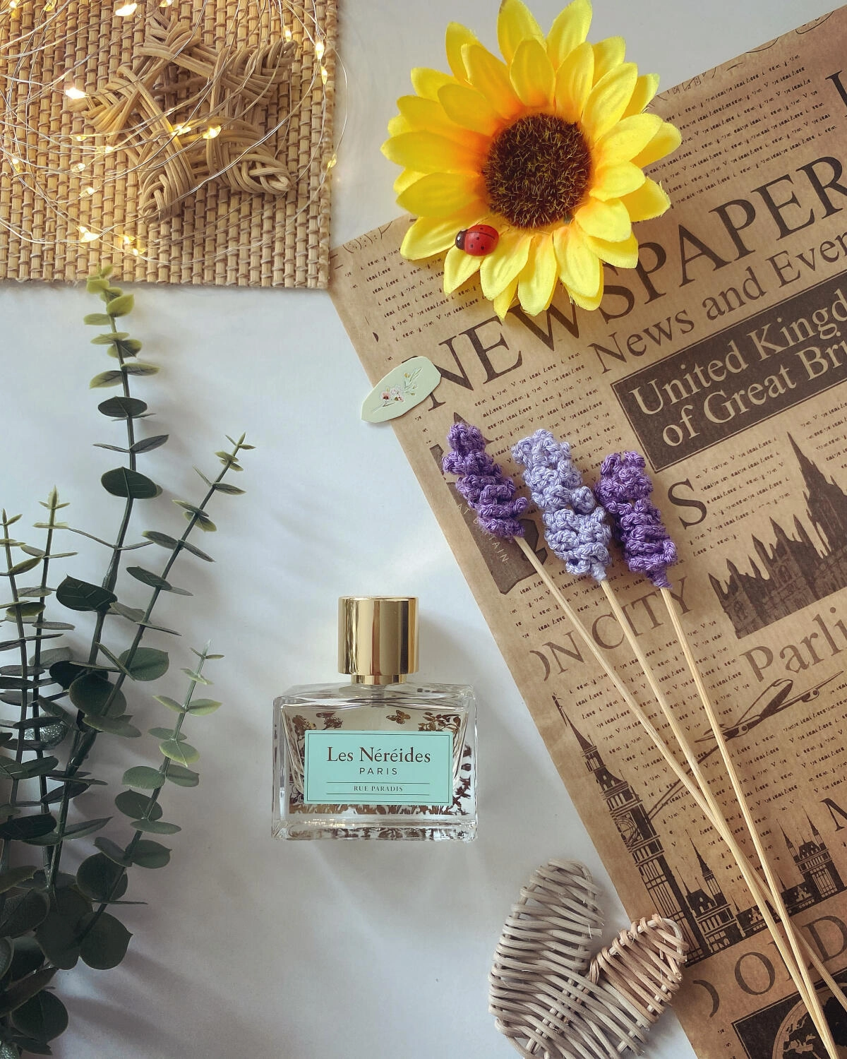 Композиций Rue Paradis от Les Nereides была выпущена в 2020 году в рамках коллекции, погружающей в сладкие и интересные зеленые ноты. Эти духи подойдут для офисной обстановки и прекрасно украсят образ любительниц водных ароматов. Их лаконичный флакон, украшенный растительными узорами, дополнен золотистым дизайном, создающим эффект объемности.