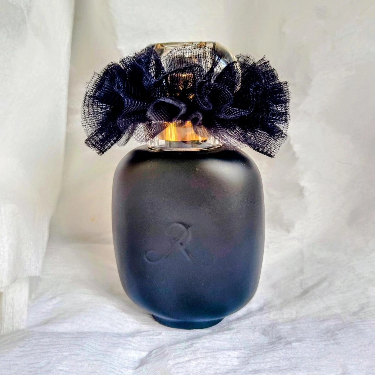 Флакон этого аромата напоминает элемент декора: он выполнен в черном матовом стекле с прозрачной сферической крышкой и оформлен черной фатиновой лентой, обвивающей горлышко, придавая ему образ грациозного черного лебедя. В аромате смешиваются тайна, мистицизм и очарование.