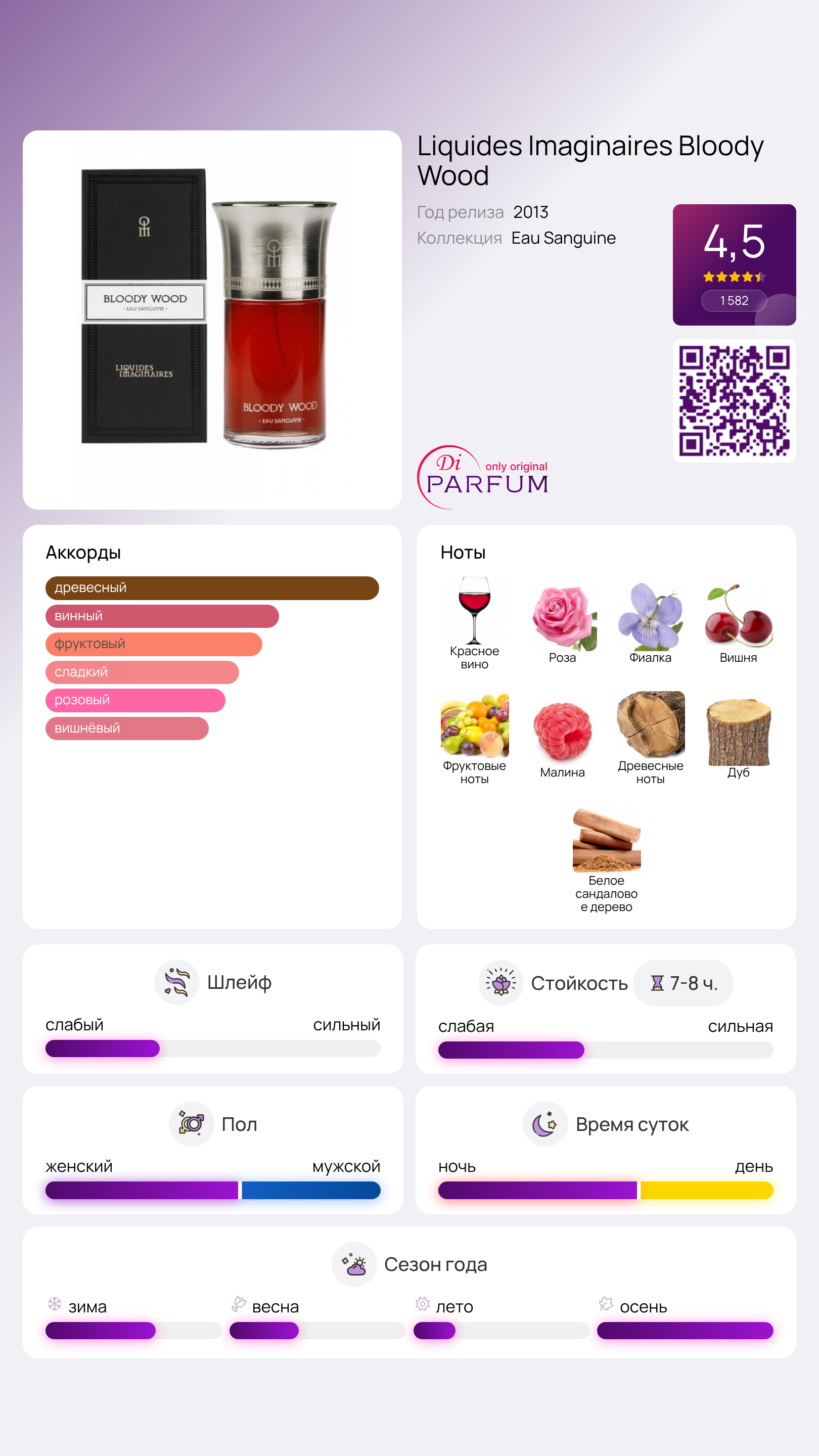 Bloody Wood - это унисекс парфюм из трилогии Eau Sanguine, вдохновленной вином. Его название отражает основную идею поэтического произведения, где воспевается любовь, нежность и чувственность.