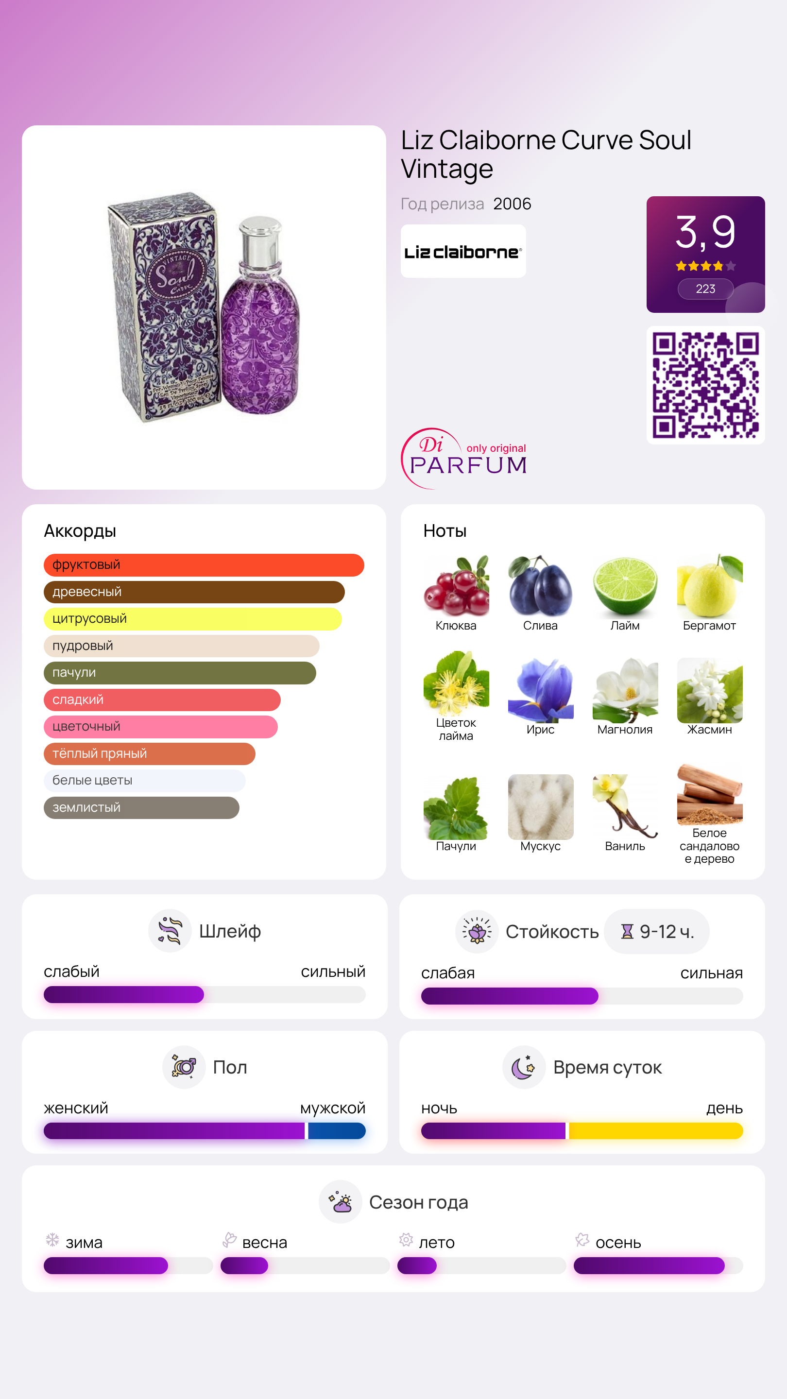 Curve Soul Vintage – это романтический аромат с цветочно-фруктовыми нотами для женщин, который был представлен компанией Liz Claiborne в 2006 году.
