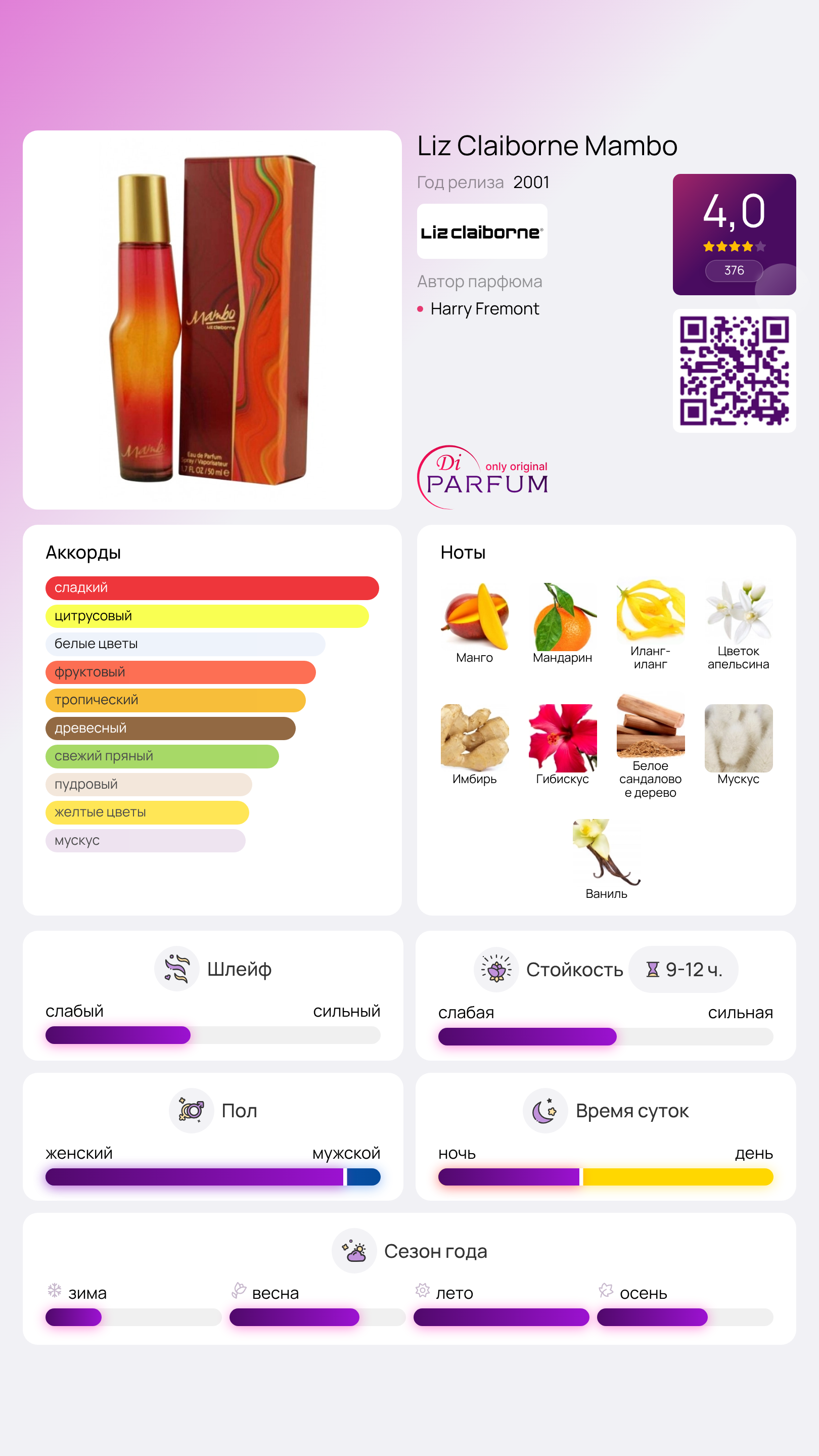 Танец мамба, наполненный энергией, страстью и sensuality, получил свое отражение в аромате Mambo for Woman от Liz Claiborne. Этот парфюм, созданный Гарри Фремонтом в 2001 году, объединяет в себе экзотическую сладость тропических фруктов и пряную огненность.