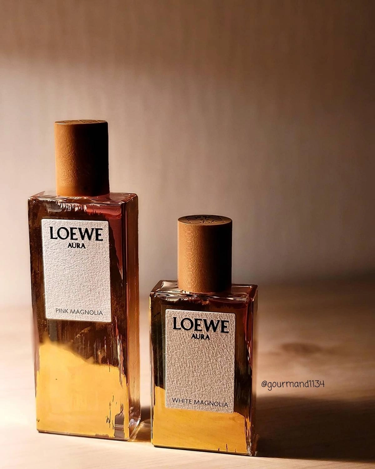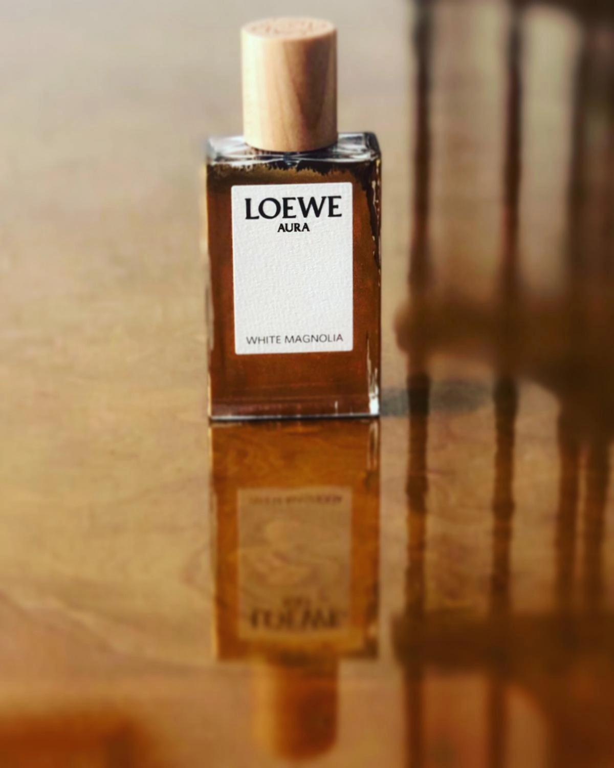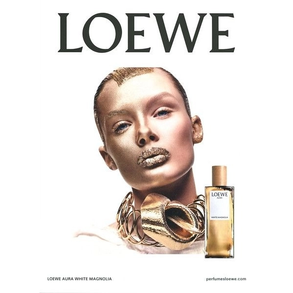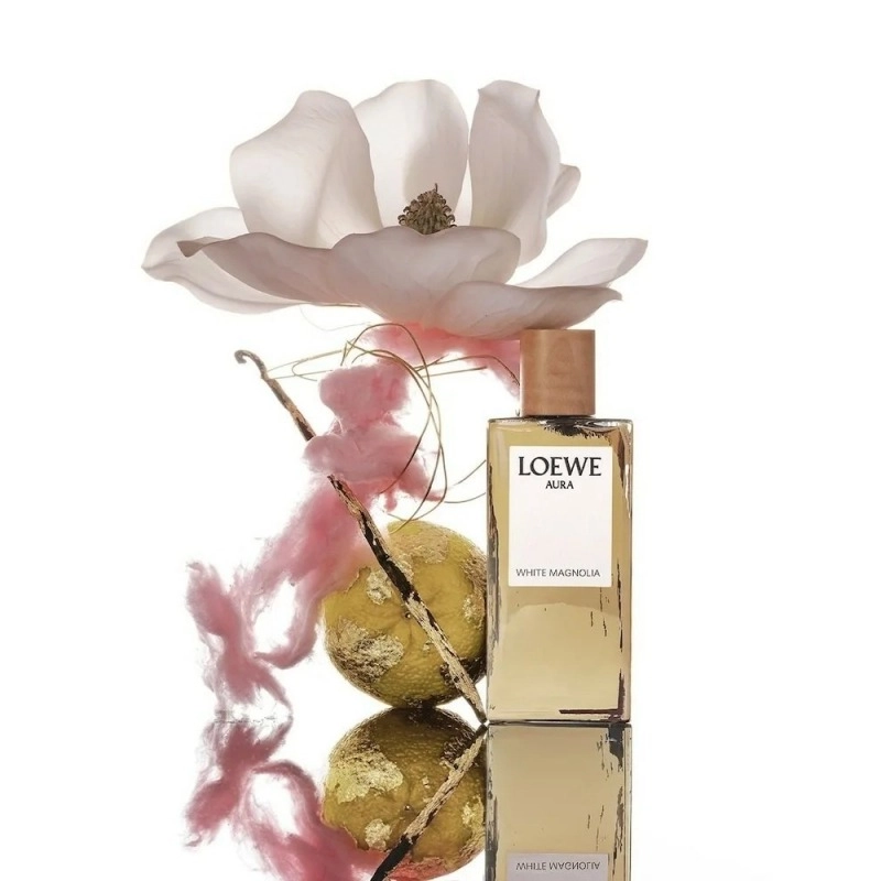 Линия Aura White Magnolia была выпущена испанским брендом Loewe в 2019 году и стала частью их разнообразного ассортимента аксессуаров. Рекламным лицом этого аромата стала модель Крис Грикайте, которая также приняла участие в показе мод Moschino в том же году. Новый флакон отличается солнцезащитным стеклом, а золотистые акценты на его поверхности содержат мельчайшие частицы золота. Крышка выполнена из натурального древесного материала платана.